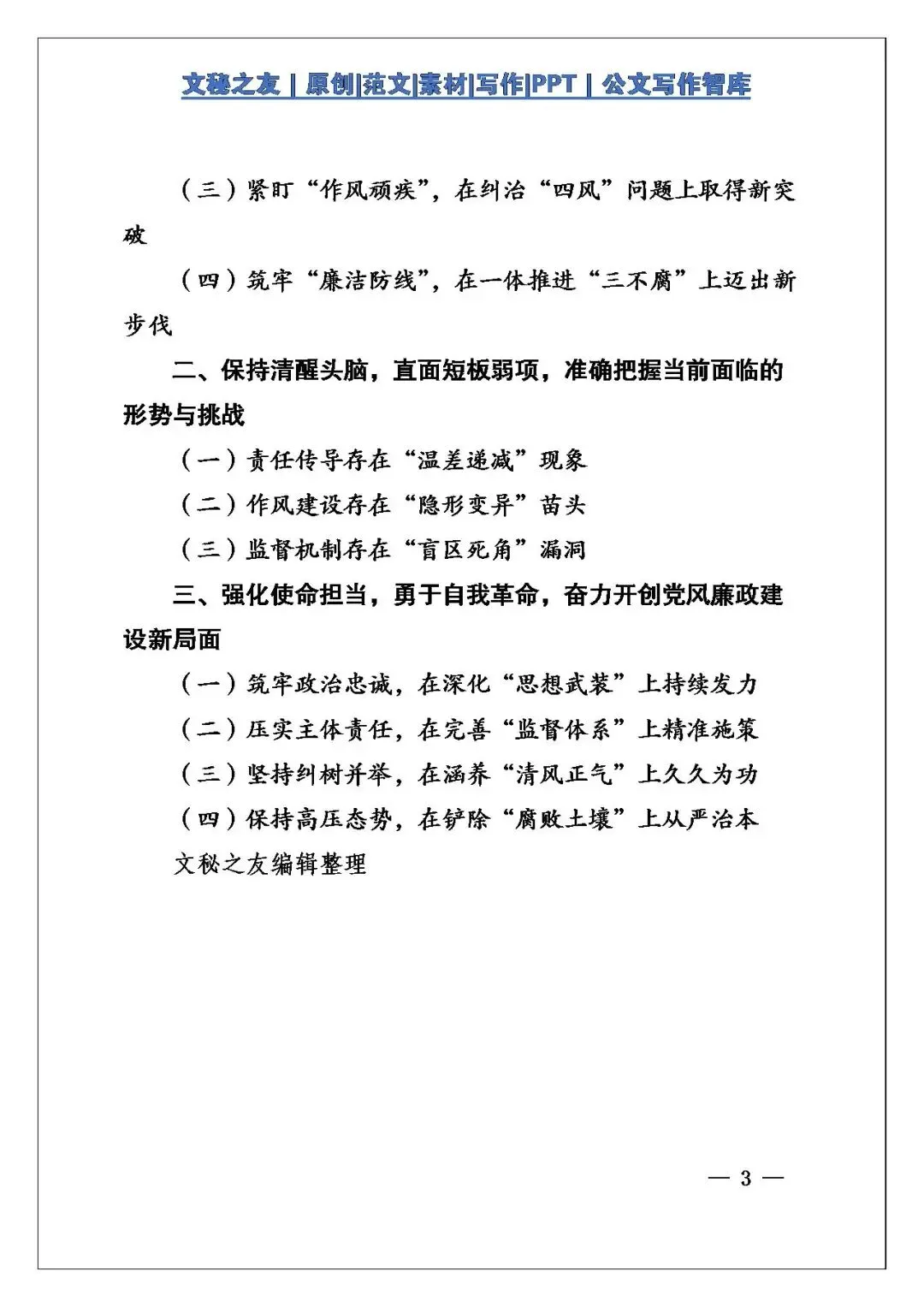 “压实责任链条”细化清单、层层签状,构建横向到边、纵向到底的责任体系;“纠治作风顽疾”“筑牢廉洁防线”直击“四风”隐形变异与监督盲区,彰显刀刃向内决心。难能的是直面“温差递减”“隐形变异”“盲区死角”等短板,提出深化思想武装、完善监督体系、纠树并举、保持高压四向发力,有政治高度,有落地抓手,为同类报告提供了可复制的样板!