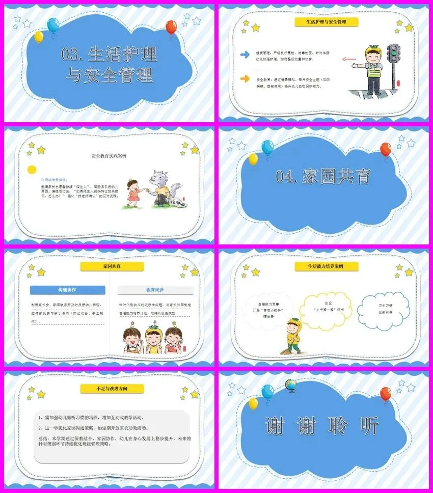 幼儿的健康成长是我们工作的首要任务。本学期,我们严格执行幼儿园的晨检制度和消毒制度,每天对幼儿进行体温检测、口腔检查等,及时发现幼儿的健康问题并妥善处理;定期对班级教室、寝室、玩具、餐具等进行全面消毒,为幼儿营造安全卫生的生活环境。针对班级内的体弱幼儿,我们特别加强了护理,根据其身体状况适当调整运动量和饮食安排,确保幼儿的身体健康。