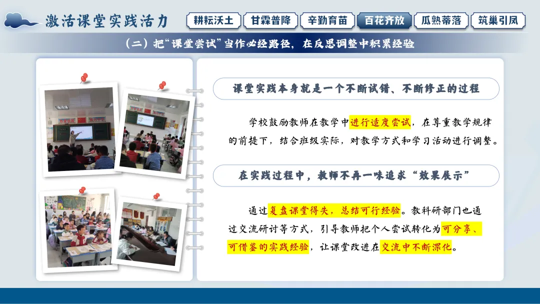 (一)把“日常课堂”当作主阵地,在真实教学中推动改变(二)把“课堂尝试”当作必经路径,在反思调整中积累经验