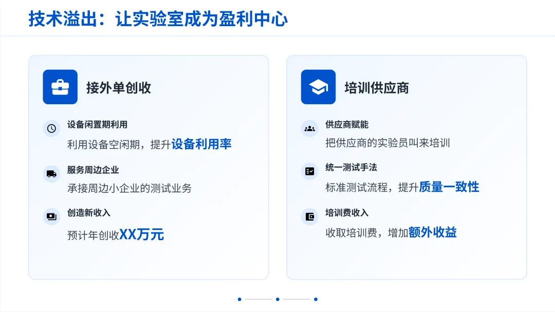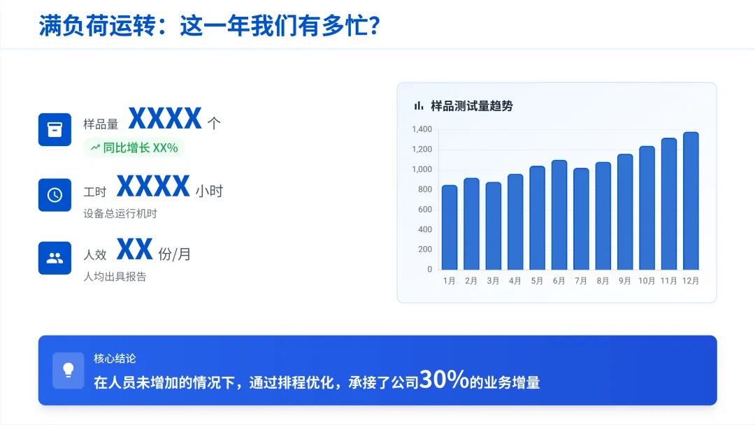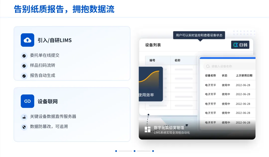 告别纸笔时代。实现检测流程的全链条数字化:委托单在线下达 → 样品条码流转 → 数据自动采集 → 报告一键生成。目标:报告出错率降低 90%,报告周期缩短 30%。