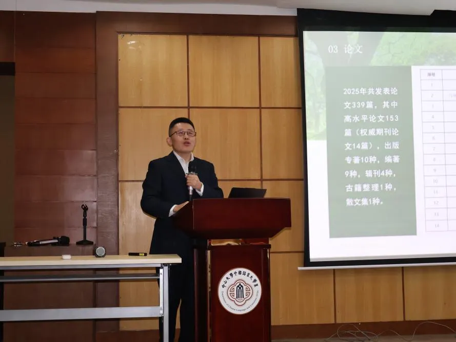 接下来,范常喜副主任作个人述职述廉报告。他首先总结了中文系2025年度科研工作取得的成绩,重点提及国家社科基金重大项目成功立项、多篇高水平学术论文发表,以及科研获奖情况等。同时,范常喜副主任围绕硕士生及博士生招生工作安排、学位考核流程优化等工作作出系统部署,明确了下一阶段的工作重点与推进路径。