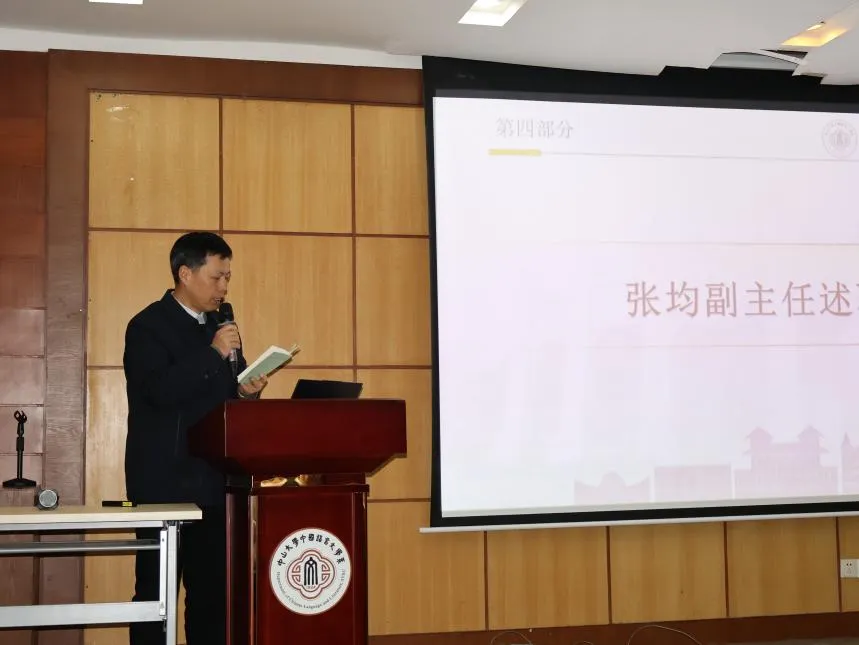 张均副主任作个人述职述廉报告,聚焦个人履职情况,系统汇报了本科生教育教学及设备管理等相关工作的实施成效。报告中,针对中文系课堂教学工作提出改进要求,强调要持续夯实本科教育教学根基,不断优化教学质量,为中文系人才培养核心任务筑牢基础。