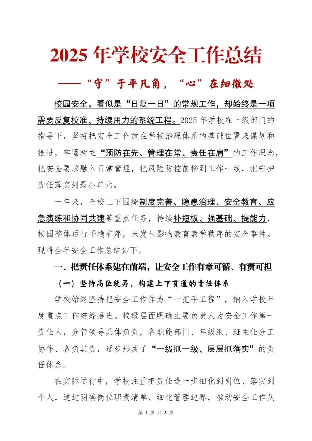 >2025年秋季学期安全工作总结:“守”于平凡角,“心”在细微处word版+PPT