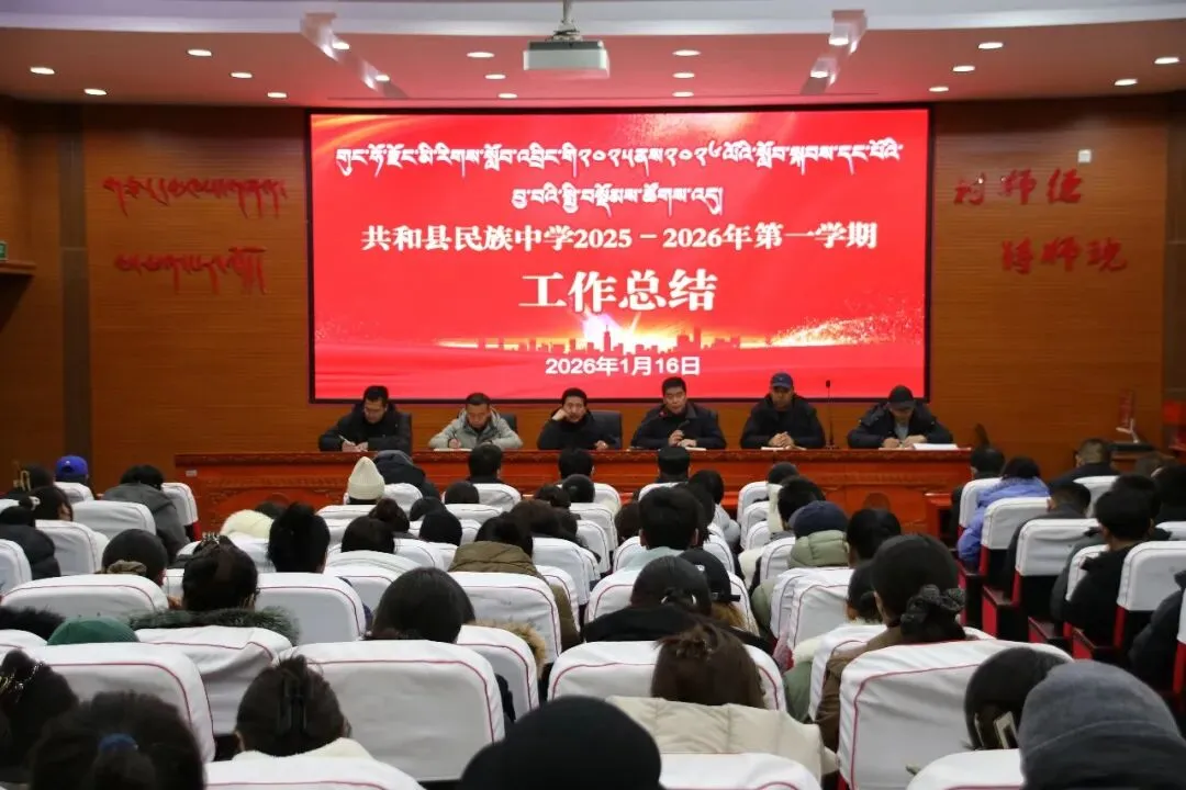 2026年 1 月 16 日,共和县民族中学党总支副书记、校长索南达杰主持召开共和县民族中学 2026 年学期工作总结会议,传达学习2026年全国教育工作会议,及共和县教育局关于做好2026年中小学寒假有关工作会议的重要精神,同时认真聆听了相关负责人全面且细致的工作汇报。此次会议紧密围绕党建工作、德育工作、后勤管理、教育教学、寒假注意事项以及新课标的学习等多个关键领域展开了卓有成效的研讨。这不仅是对学校过去一学期工作的全面总结与反思,更是为学校的长远、可持续发展以及学生的健康茁壮成长进行了高瞻远瞩的谋篇布局,具有承前启后、继往开来的重要意义。