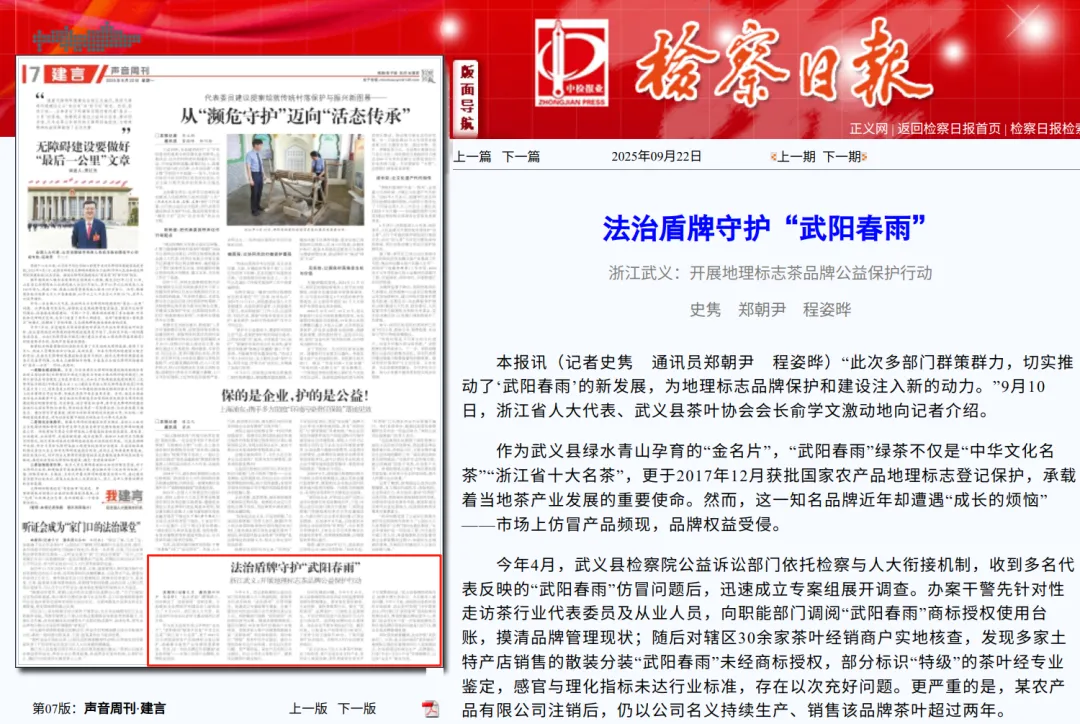 “武阳春雨”是中国有机茶之乡—武义县的著名地理标志茶产品,2025年3月,武义县检察院对多名代表委员反映的茶叶市场乱象开展调查核实,同年5月,向职能部门发出行政公益诉讼检察建议书,相关部门联合开展专项整治活动,同时推动县政府组织多方召开品牌保护联席会议,修订完善《“武阳春雨”茶商标使用管理办法》,会签协同保护机制,助力乡村产业振兴。