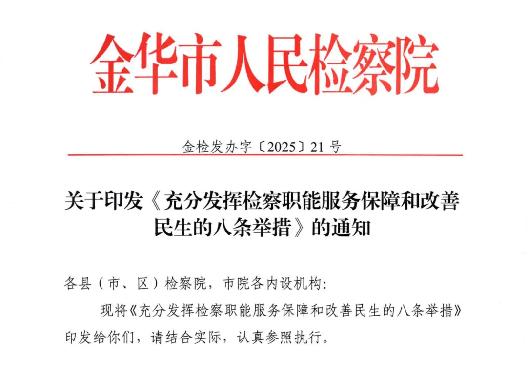 金华市检察院于2025年7月制定出台《充分发挥检察职能服务保障和改善民生的八条举措》,谋深做实“检护民益”专项行动,部署开展“食药安全益路行”“美丽河湖”“无障碍环境建设”等专项监督行动,立案办理了一批民事、行政公益诉讼案件。