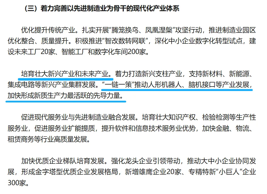 培育壮大新兴产业和未来产业。着力打造新兴支柱产业,支持新材料、新能源、集成电路等新兴产业集群发展。“一链一策”推动人形机器人、脑机接口等产业发展,加快形成新质生产力最活跃的先导力量。