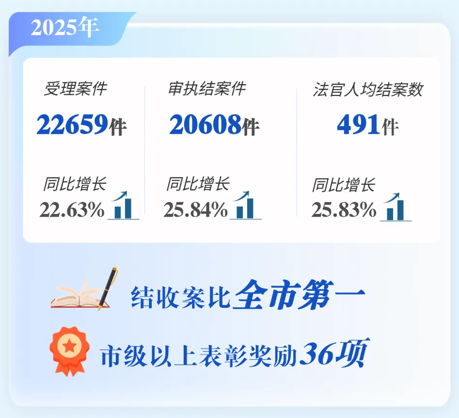 审理的“七旬老人千里寻亲案”被央视《今日说法》采用,15项调研成果获省级以上荣誉,1名干警在全市“老政法精神”主题宣讲会上作事迹报告。
