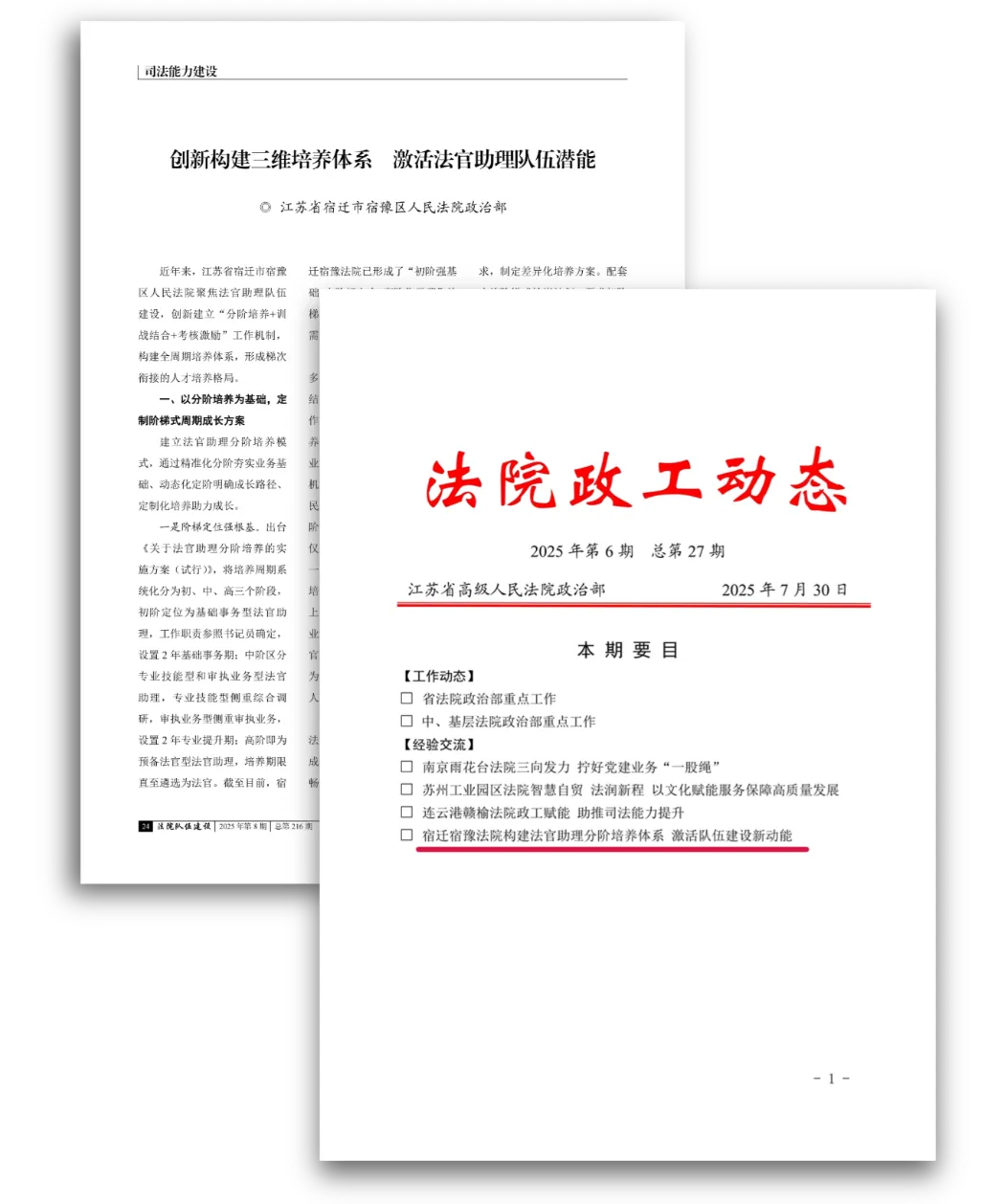 探索建立法官助理分阶培养新模式,相关经验做法被《最高法院队伍建设》和《江苏法院政工动态》采用。
