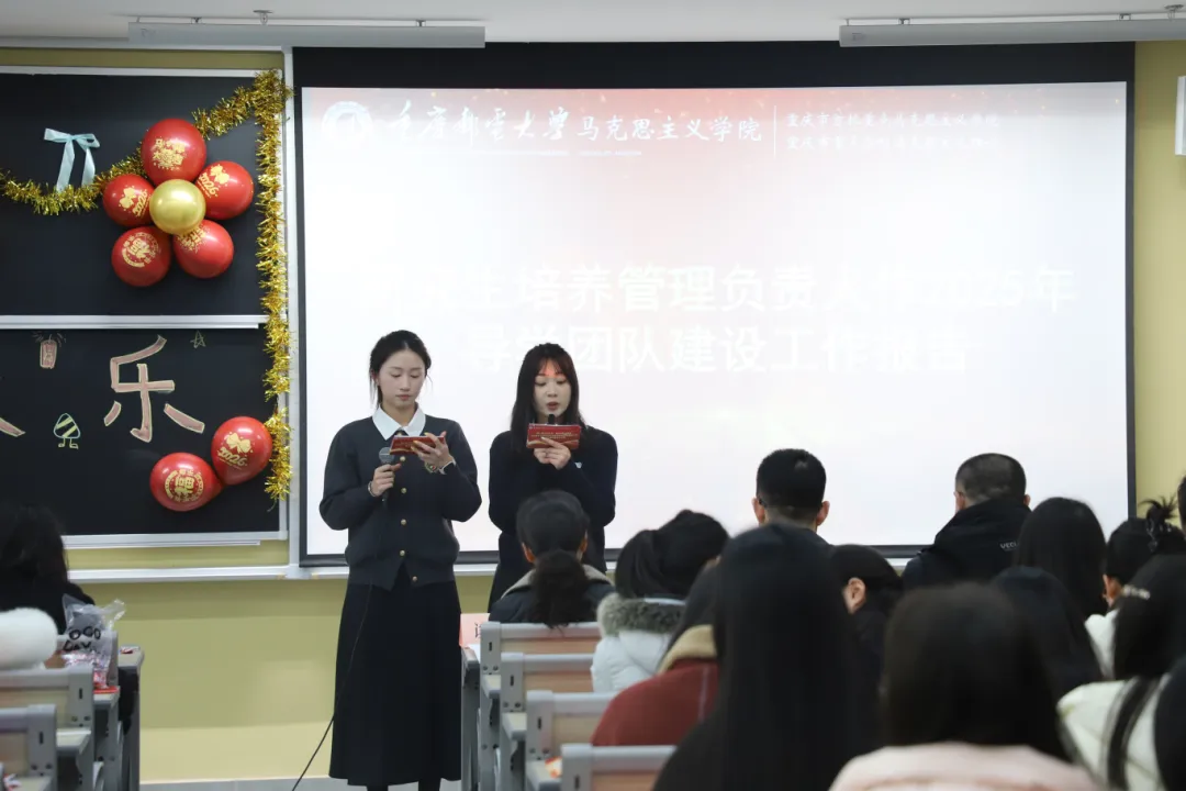 灵蛇辞旧承嘉绪,骏马迎新启华章。为系统复盘年度工作成效,表彰先进典型、凝聚奋进力量,推动研究生培养与导学团队建设提质增效,学院于2026年1月6日在9208教室召开2025年度研究生总结表彰大会暨导学团队建设工作会。学院“马克思主义理论”学科负责人代金平老师、党委书记谈娅老师、院长谢俊老师、副院长郭海成老师、“马克思主义中国化研究”学科团队负责人李俊斌老师、“中国近现代史基本问题研究”学科团队学科秘书李云霄老师、“思想政治教育”学科团队楚武干老师、辅导员唐子涵老师及各导学团队研究生代表齐聚一堂,大会由2025级研究生杨希雅、万森梅同学主持。