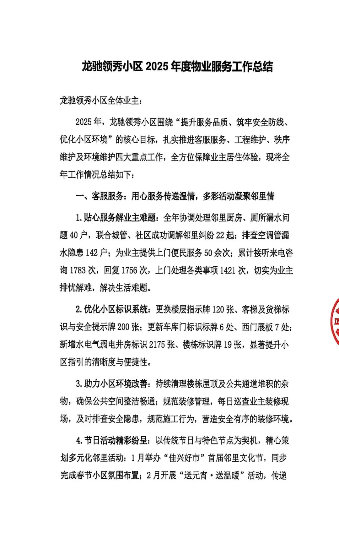 >2025年度龙驰领秀小区物业服务工作总结