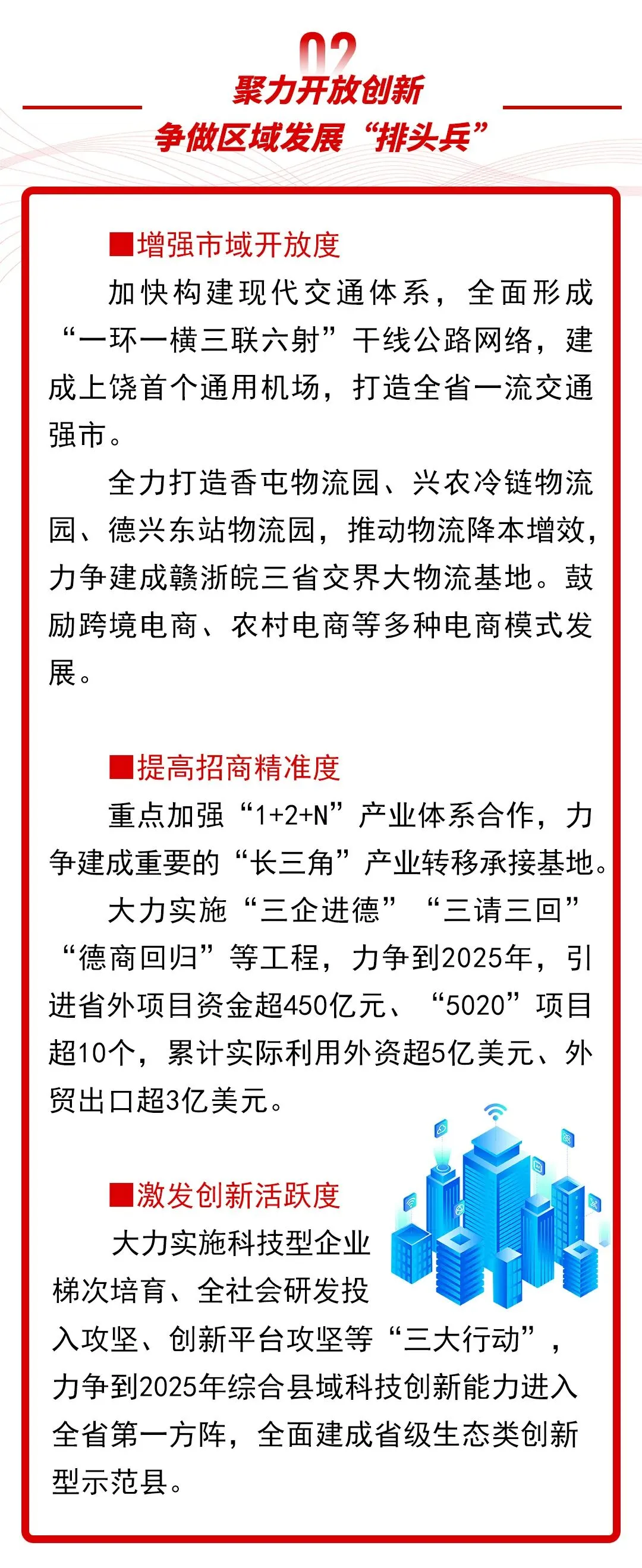“放管服”改革领跑上饶,蝉联全省十佳优化营商环境县。荣获国家开发性金融支持返乡创业试点县、全省绿色金融改革试点县。☑ 对外开放更有广度