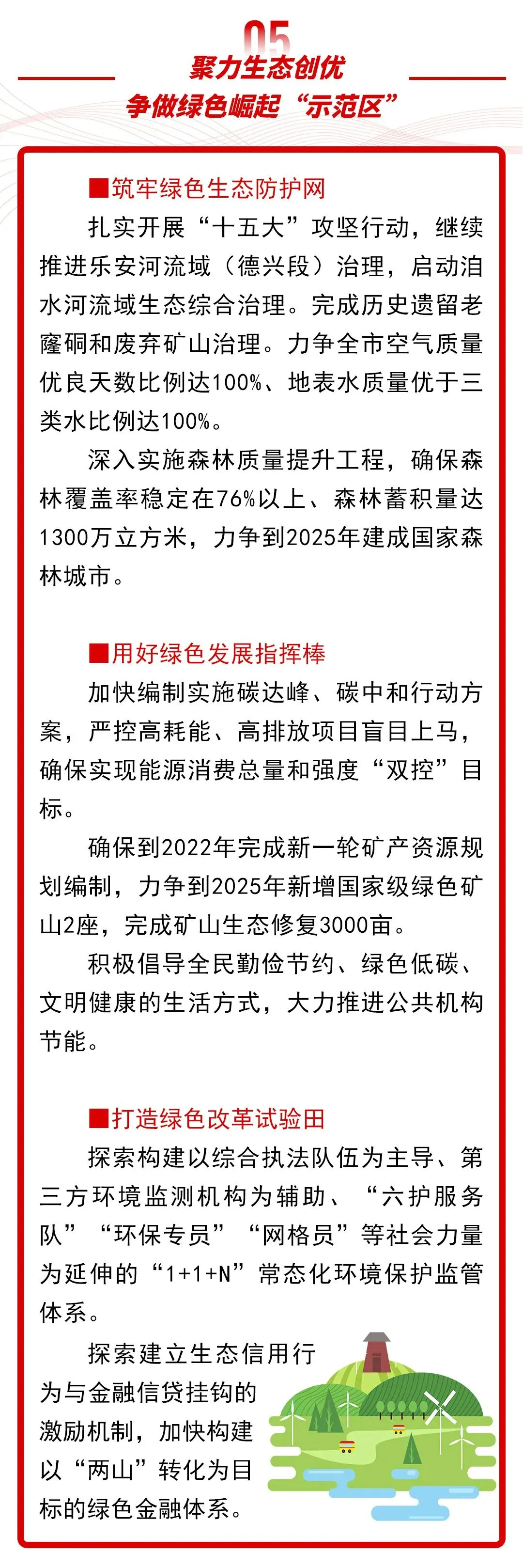 严格落实“河长制”“林长制”,获评“中国天然氧吧”。建成国家级绿色矿山4座,完成矿山生态修复4000余亩,获评全国首批绿色矿业发展示范区。☑ 生态制度不断健全