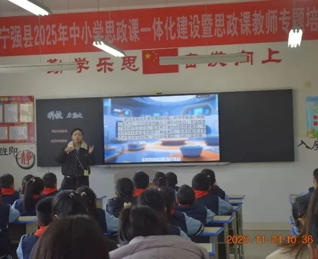 党支部构建“课堂赋能+名师引领+培训提质”的思政育人体系,育人成效显著。庞敏老师、王艳老师获评市级优秀思政课教师,庞敏老师更斩获省级课程思政大奖,以专业能力为思政教育赋能;学校成功承办全县中小学思政课一体化建设暨专题培训,张淑兰老师执教的《科技力量大》一课,以“扫码支付”“智能家电”等生活场景为切入点,让学生在互动体验中感受科技温度与家国情怀,打造思政课堂新样态。