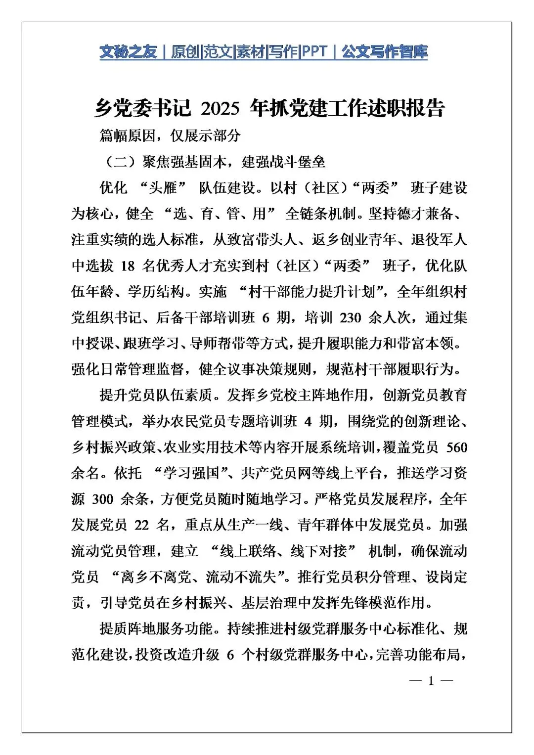 今天这篇《乡党委书记2025年抓党建工作述职报告》,写作角度紧贴乡党委书记的核心职责,建强战斗堡垒、推动融合发展等维度展开,把党建工作与乡村振兴、产业发展、群众服务深度绑定,体现政治担当,展现实干成效。