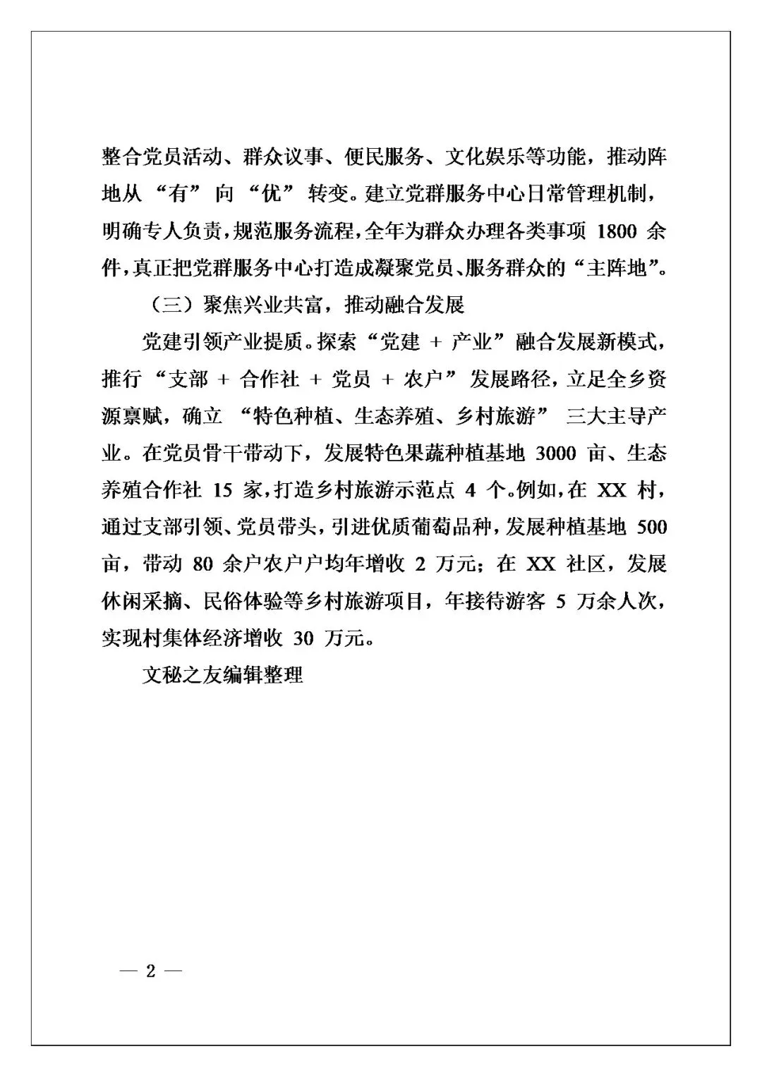 写作方法上善于用数据和案例说话,像文章中这样的比喻“选拔18名优秀人才充实到村‘两委’班子”“培训230余人次”“发展特色果蔬种植基地3000亩”等具体数据,搭配“XX村葡萄种植基地”“XX社区乡村旅游项目”等实例,让内容扎实可感,避免了空泛的表述。