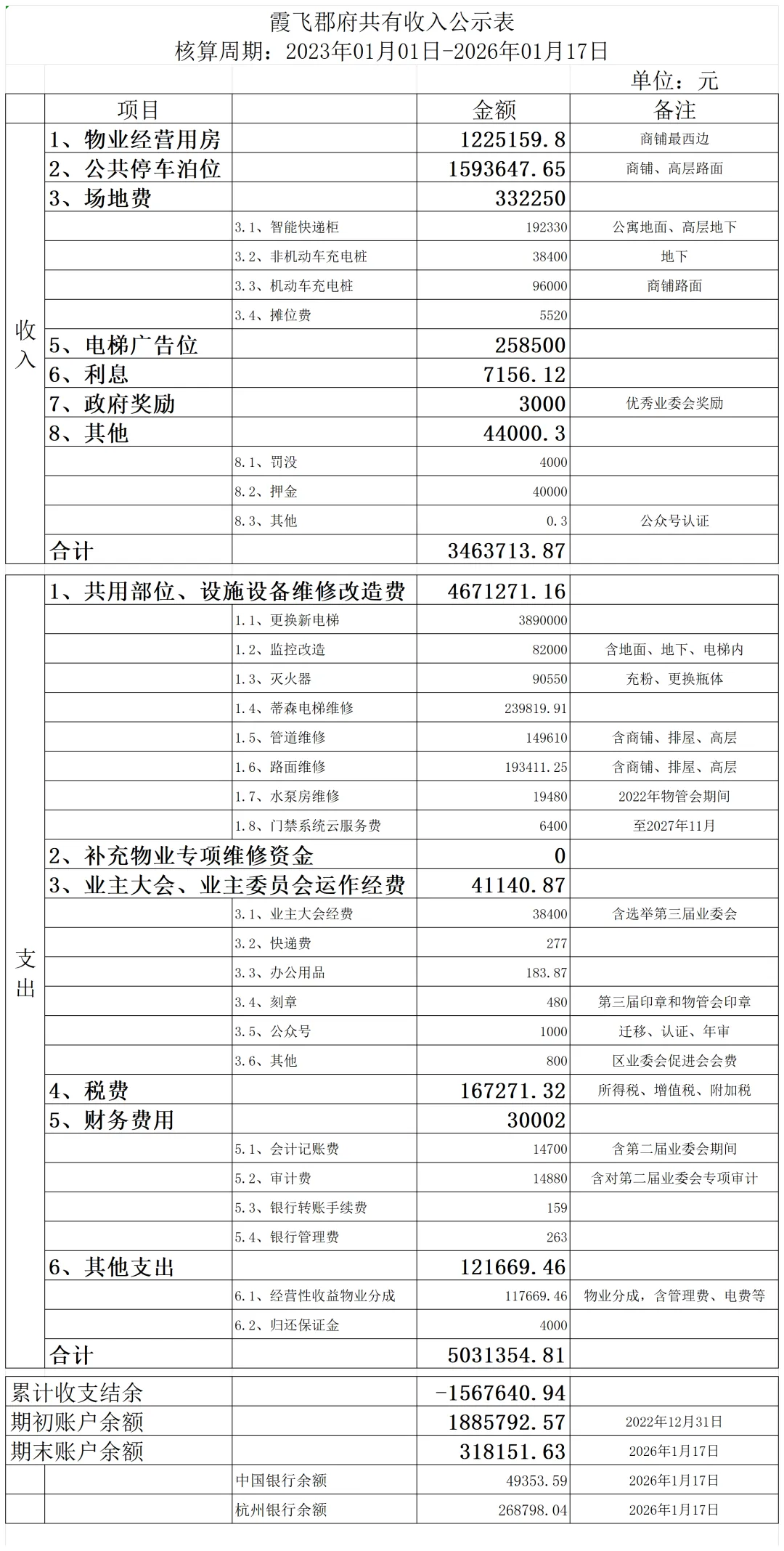 过去三年,业委会严格遵循《议事规则》及小区管理规约,规范管理小区公共收益,坚持“取之于业主、用之于业主”的原则,确保资金使用透明、合规、高效。三年各项累计收支如下: