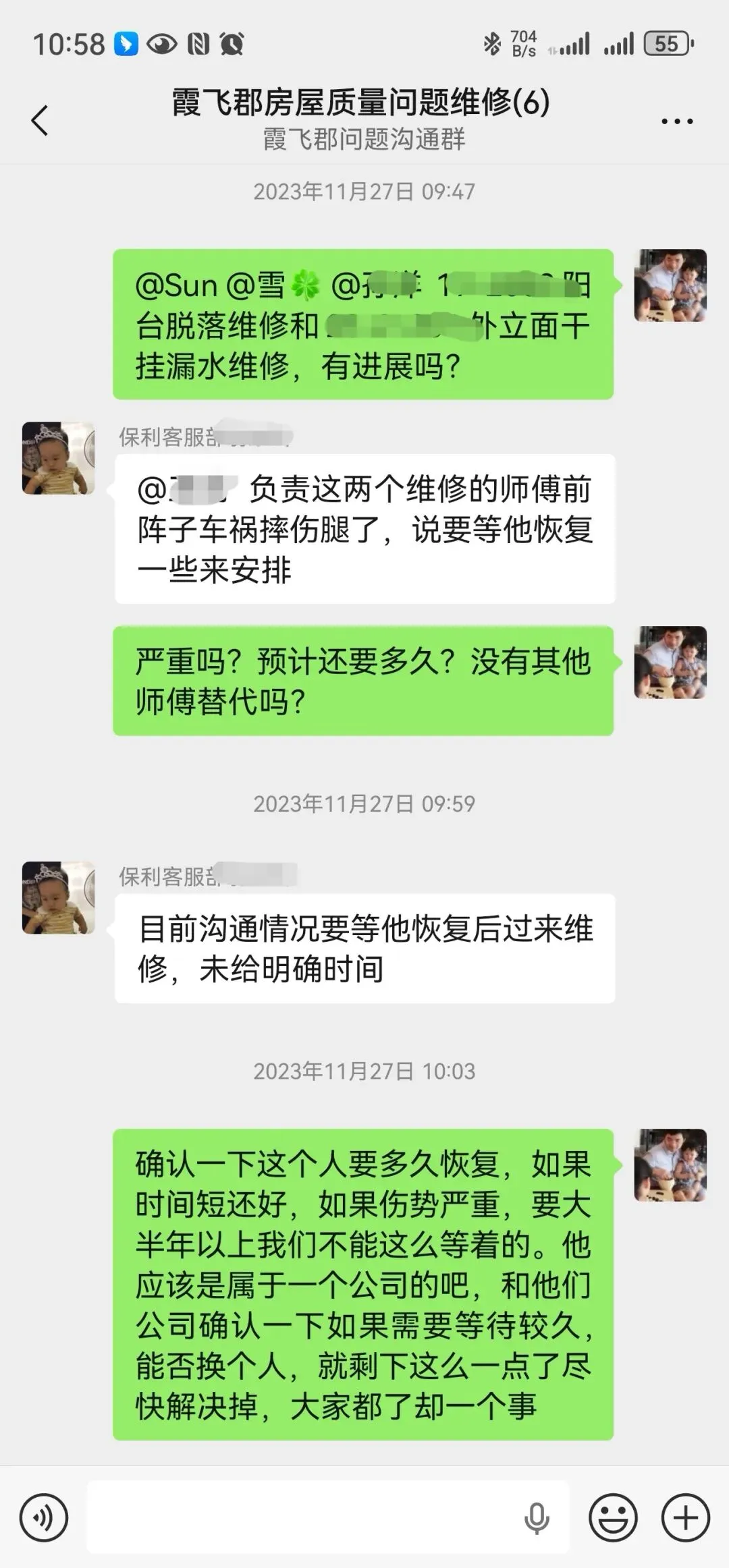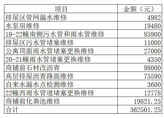 2. 公区渗漏维修:前期物业已完成小区外墙等公共区域渗漏情况统计,因本届业委会即将届满,未能推进维修工作。
