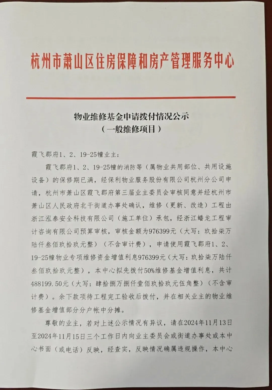 针对小区消防设施设备老化失效的问题,业委会经集体表决并按法定绿色通道程序,于2024年11月正式申请使用物业维修资金976399元,专项用于消防设施设备全面更新改造。目前该笔资金预付款已顺利下拨,项目已竣工并通过验收,资金结算严格遵循维修资金使用规范,联合第三方审计机构开展核查工作,确保每一笔资金都用在实处。