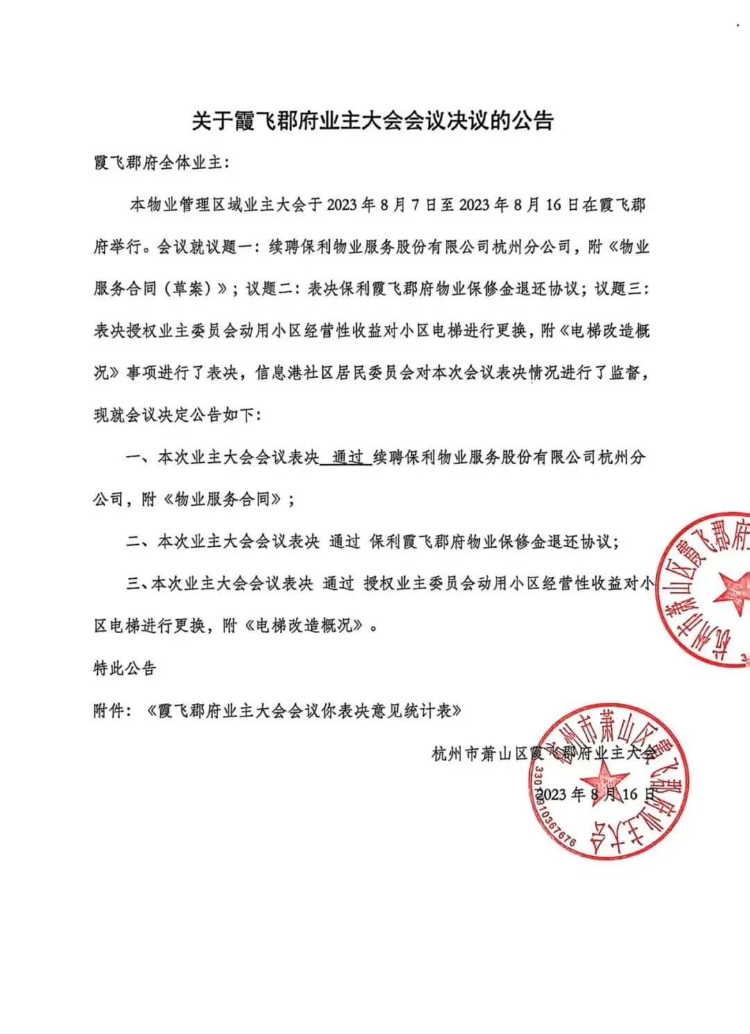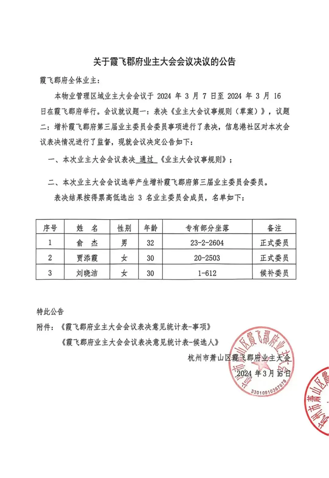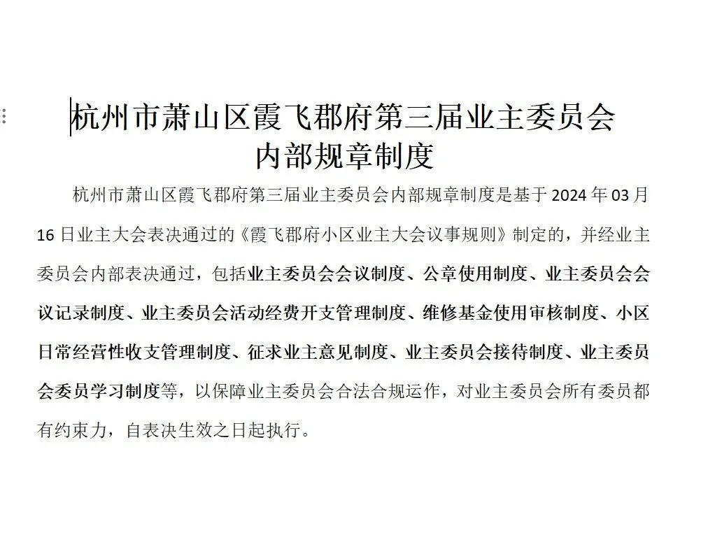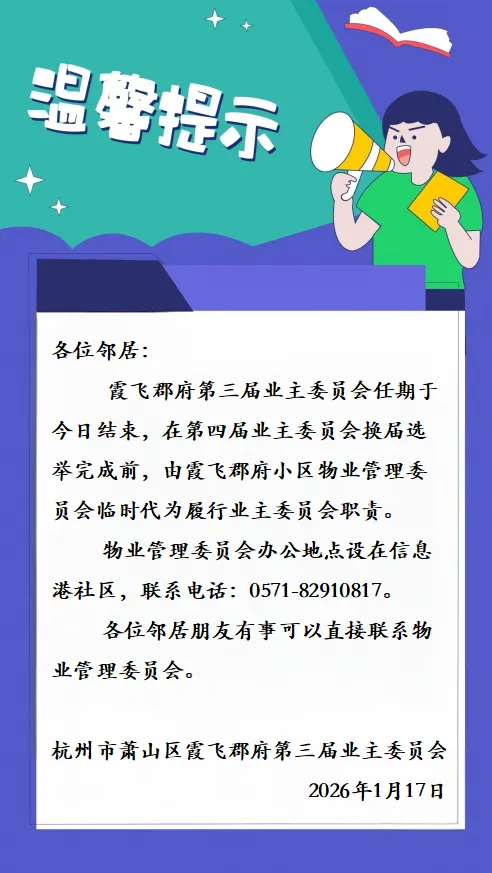 杭州市萧山区霞飞郡府第三届业主委员会