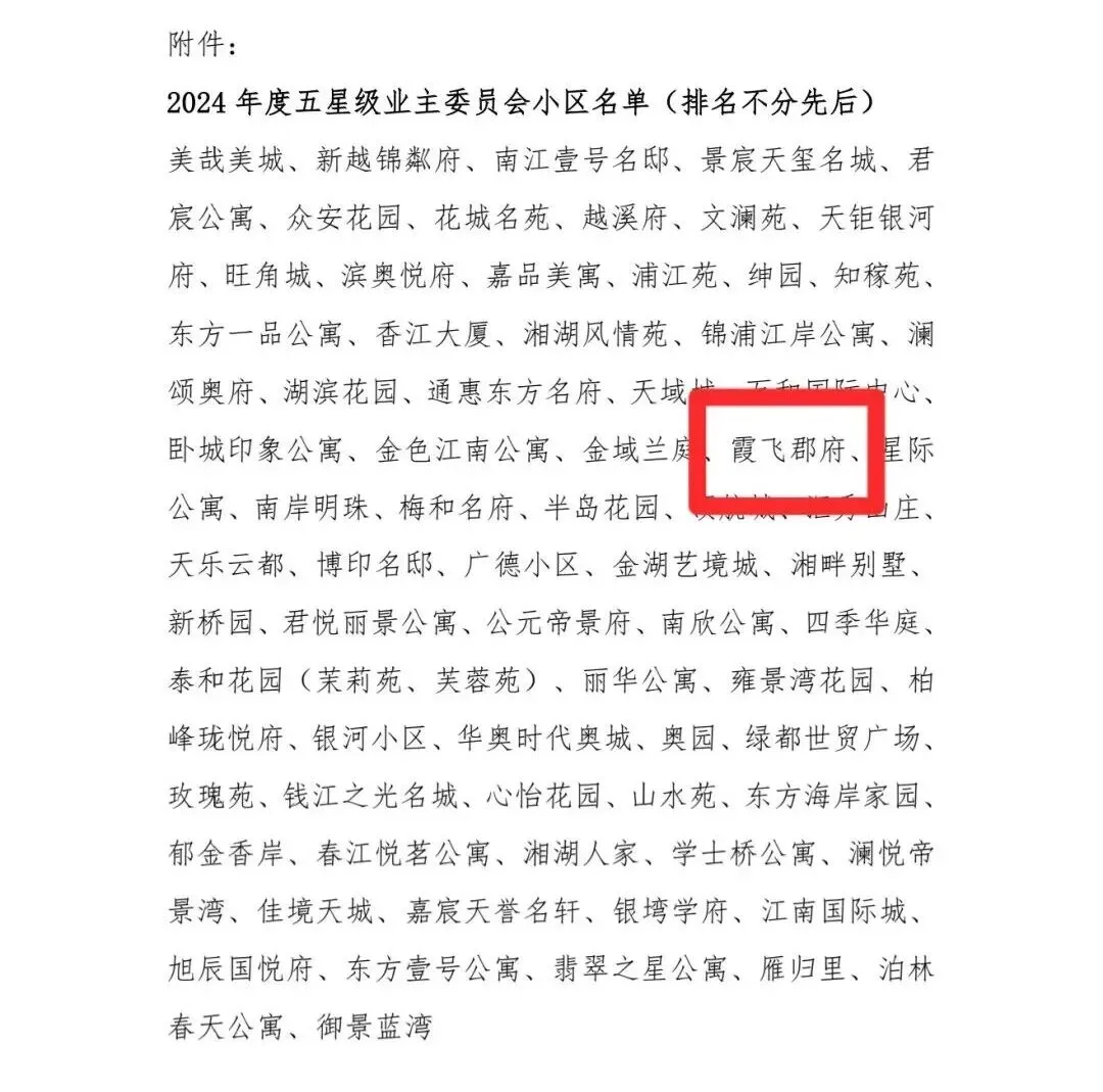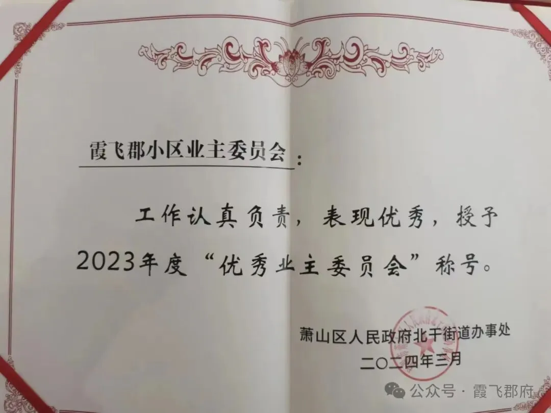 在全体业主的信任支持与业委会委员的团结协作、无私奉献下,霞飞郡府业委会工作获得上级部门认可,2023年度被北干街道评为“优秀业主委员会”,2024年成功获评五星业委会,这份荣誉既是对过往工作的肯定,也是对全体业主支持的感恩。