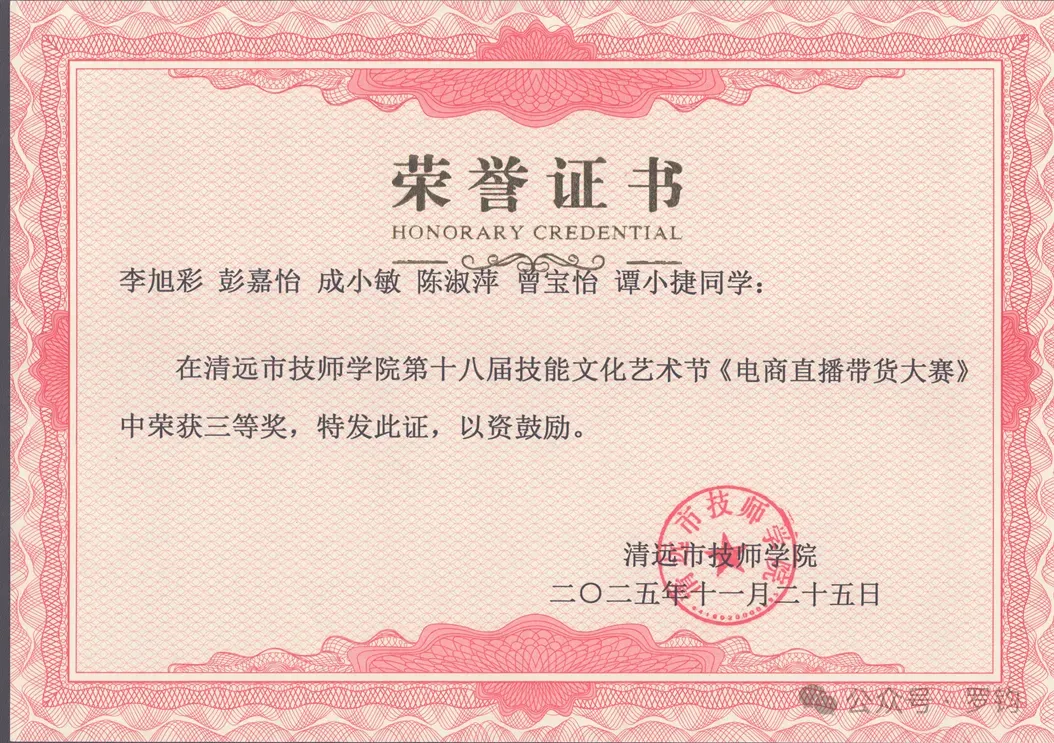 2025.11.25李旭彩、彭嘉怡、成小敏、陈淑萍、谭小捷同学在清远市技师学院第十八届技能文化艺术节《电商直播带货大赛》中荣获三等奖;