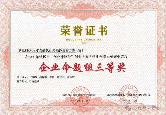 赵梓楹、李妍、陈宇君和师兄甘旻皞、师姐黄雨欣的梦派科技32寸直播机社交媒体运营方案 项目在2025年清远市"创业冲锋号"创业大赛大学生创意专项赛中荣获企业命题组三等奖。