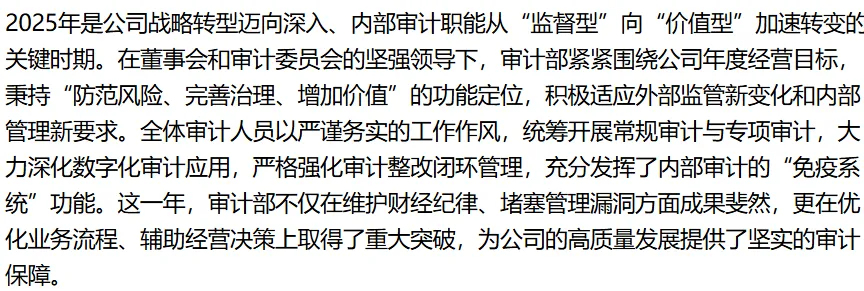 (三)赋能数字转型,激发智慧审计活力。一是推进数字化审计应用。面对海量业务数据和日益复杂的经营环境,传统手工审计模式已难以满足需求,数字化转型成为必然选择。2025年,审计部大力推进非现场审计与大数据分析技术的应用,搭建了内部审计数据分析平台,初步实现了对关键财务指标和异常业务数据的实时监测。
