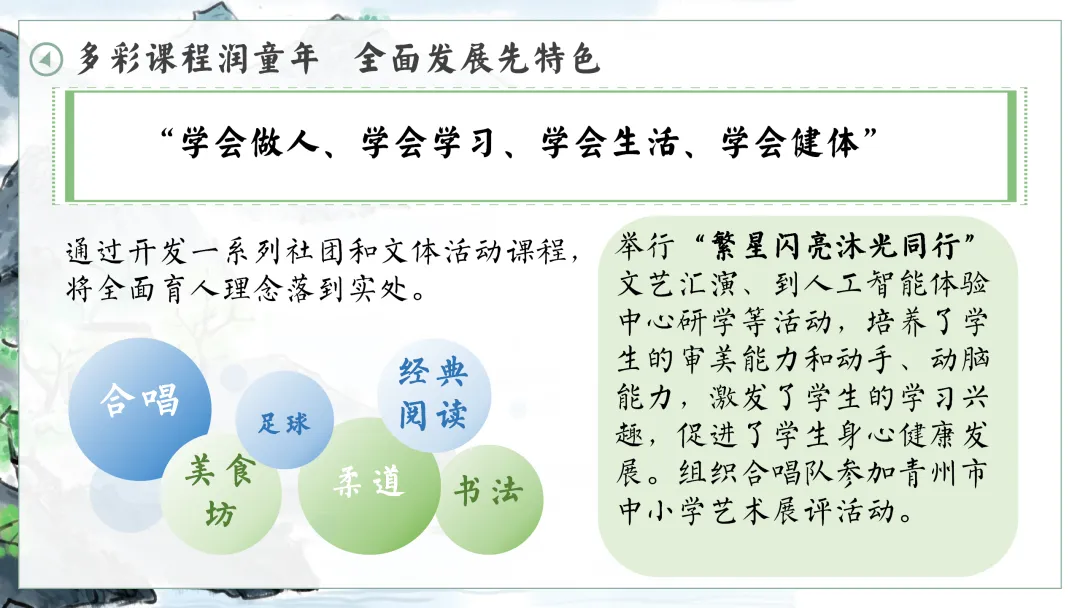 学校秉持让学生“学会做人、学会学习、学会生活、学会健体”的理念,通过开发一系列社团和文体活动课程,将全面育人理念落到实处。根据学生需求和学校实际组建了合五、教师发展展风采,暖心关爱暖人心