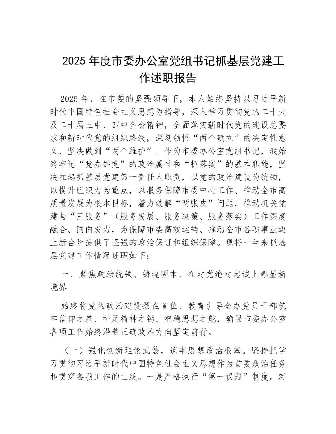 >2025年度市委办公室党组书记抓基层党建工作述职报告