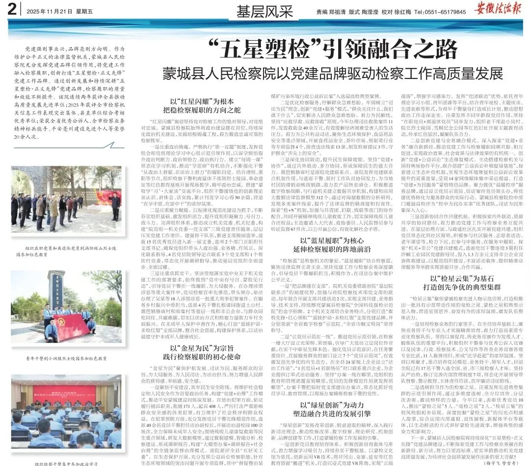 数字赋能,检察监督效能更高。持续落实县人大常委会对数字检察工作审议意见,聚焦实战应用,常态化运用大数据法律监督模型办案385件,以数字赋能破解监督瓶颈。助力社会治理,靶向推进大数据法律监督重点项目10个,制发检察建议62件,推动解决民办养老机构违规套取财政补贴、休闲娱乐场所违规经营等一批民生领域突出问题。强化数字检察品牌建设,4个自建模型,经最高检推广后被全国489个检察院应用,我院荣获全省检察机关“以高质量模型推动高质效办案”竞赛第一名,相关经验被《安徽法治报》报道。