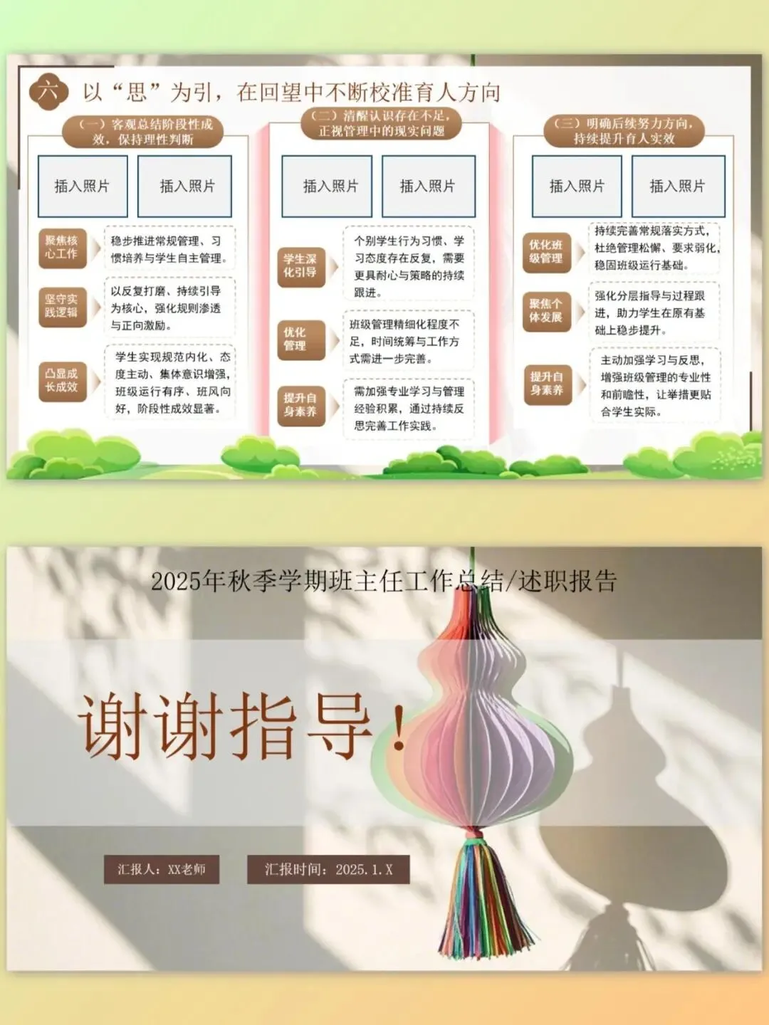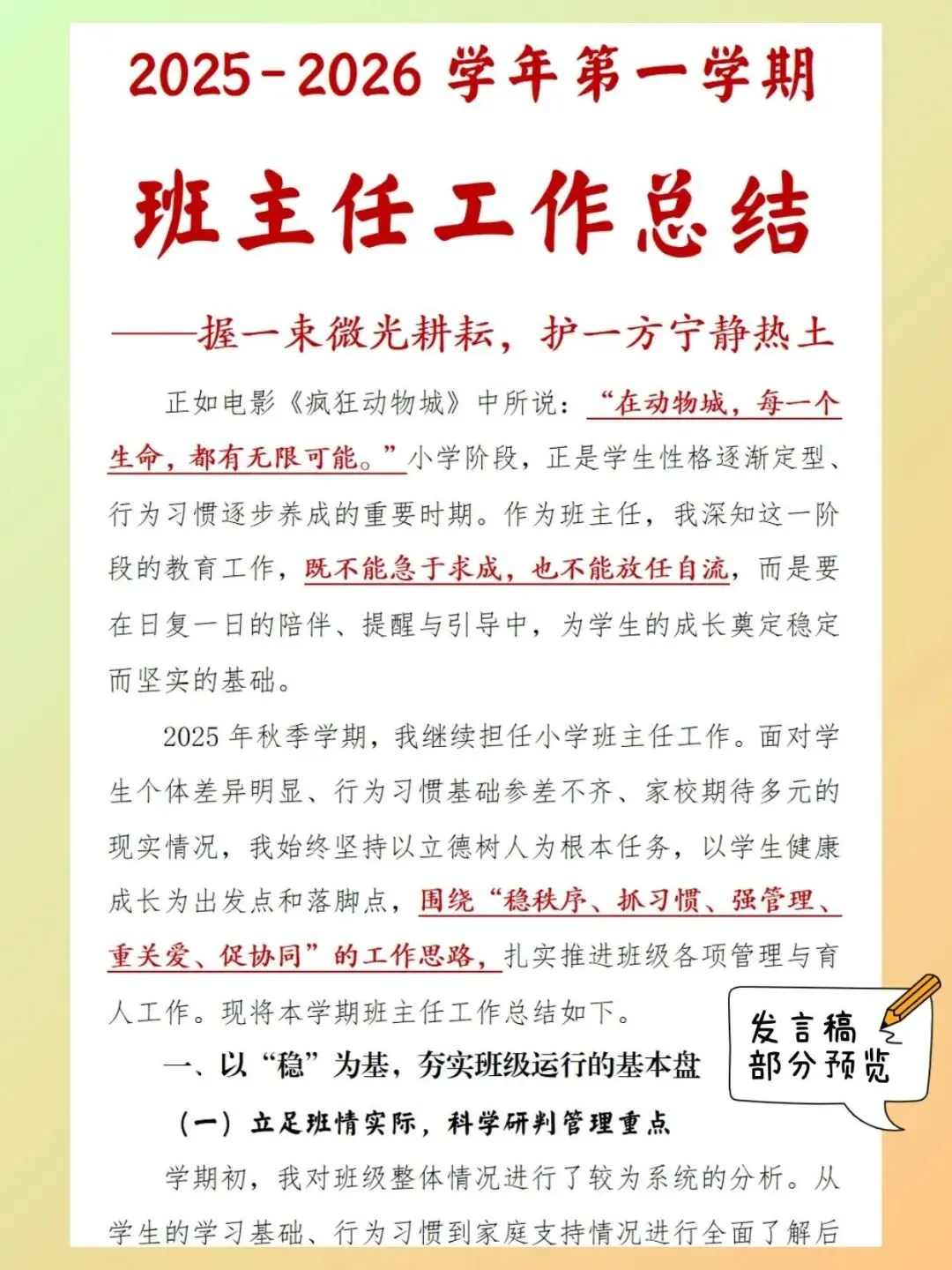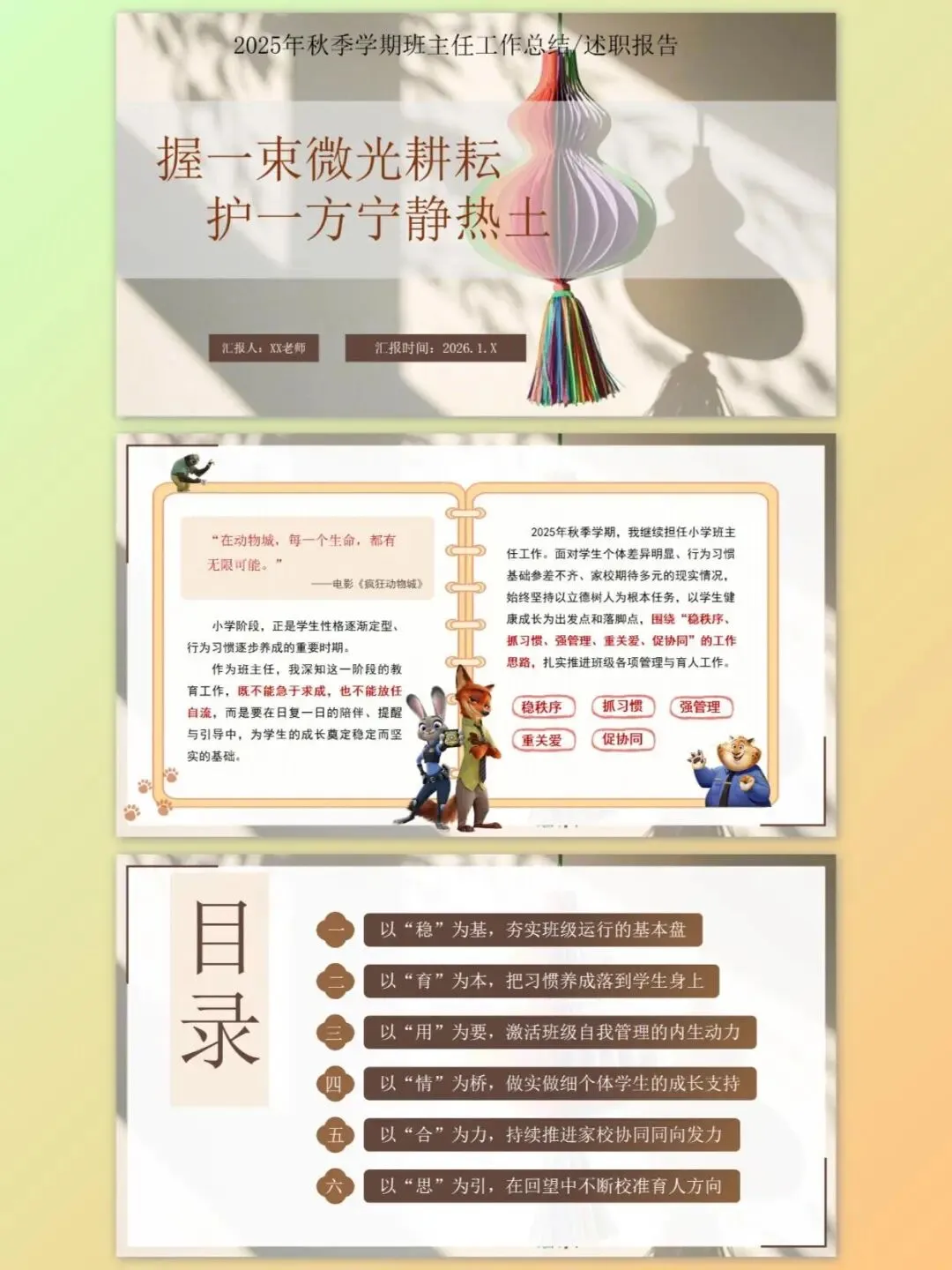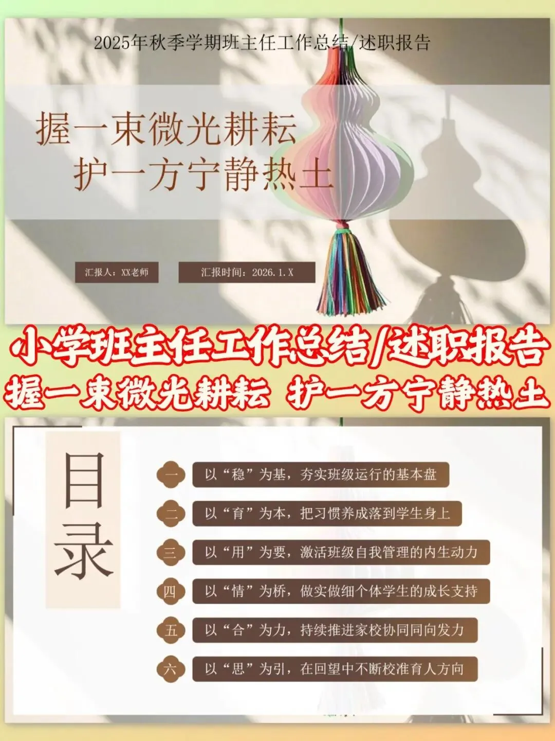 课件为小学班主任期末工作总结/述职报告,主题为:握一束微光耕耘,护一方宁静热土。 课件包含15页PPT+4550字发言稿。 课件目录: 一、以“稳”为基,夯实班级运行的基本盘 二、以“育”为本,把习惯养成落到学生身上 三、以“用”为要,激活班级自我管理的内生动力 四、以“情”为桥,做实做细个体学生的成长支持 五、以“合”为力,持续推进家校协同同向发力 六、以“思”为引,在回望中不断校准育人方向本文内容来源于网络 版权归原作者所有、如有侵权,联系删除