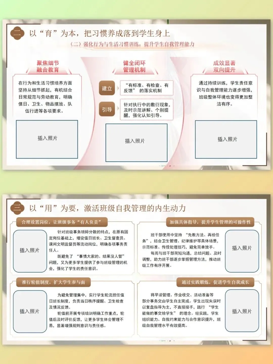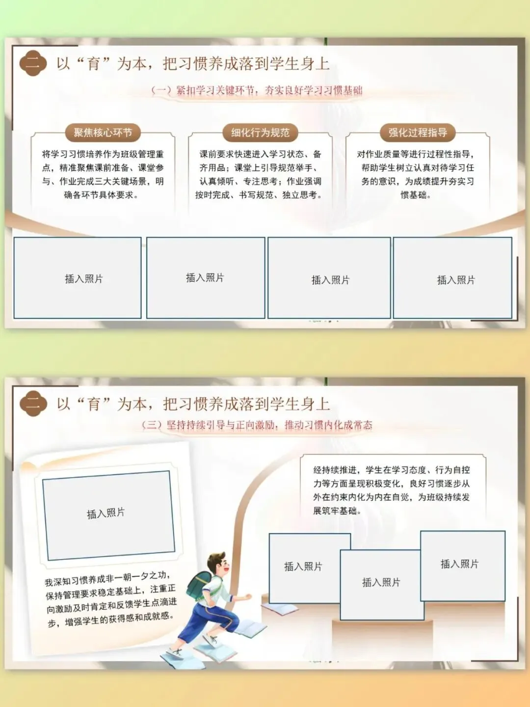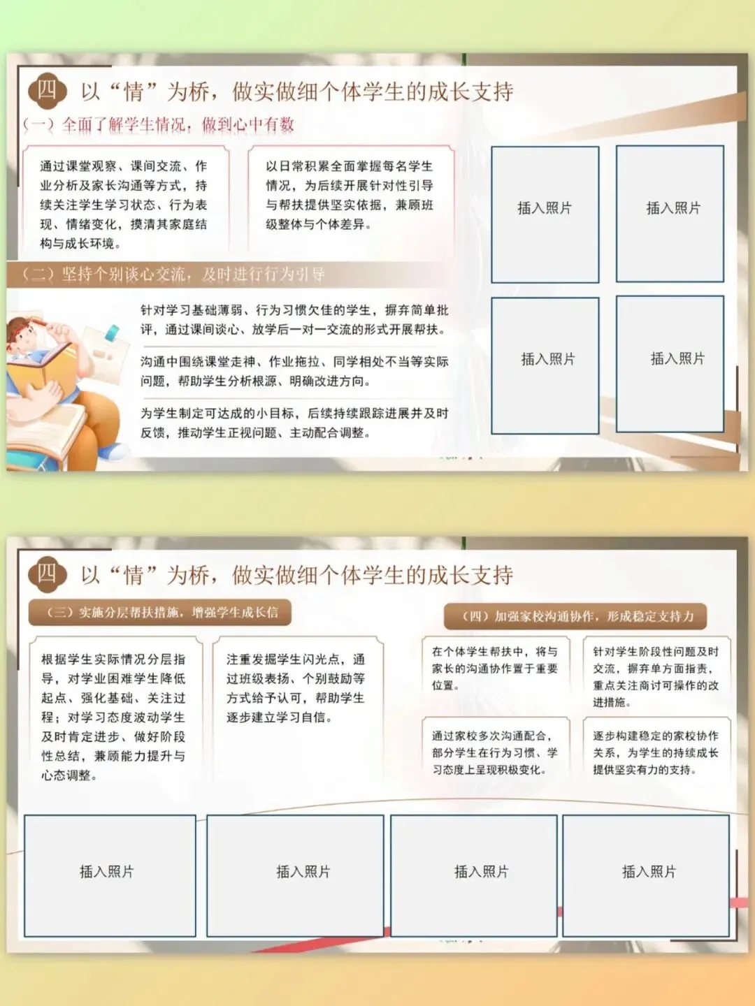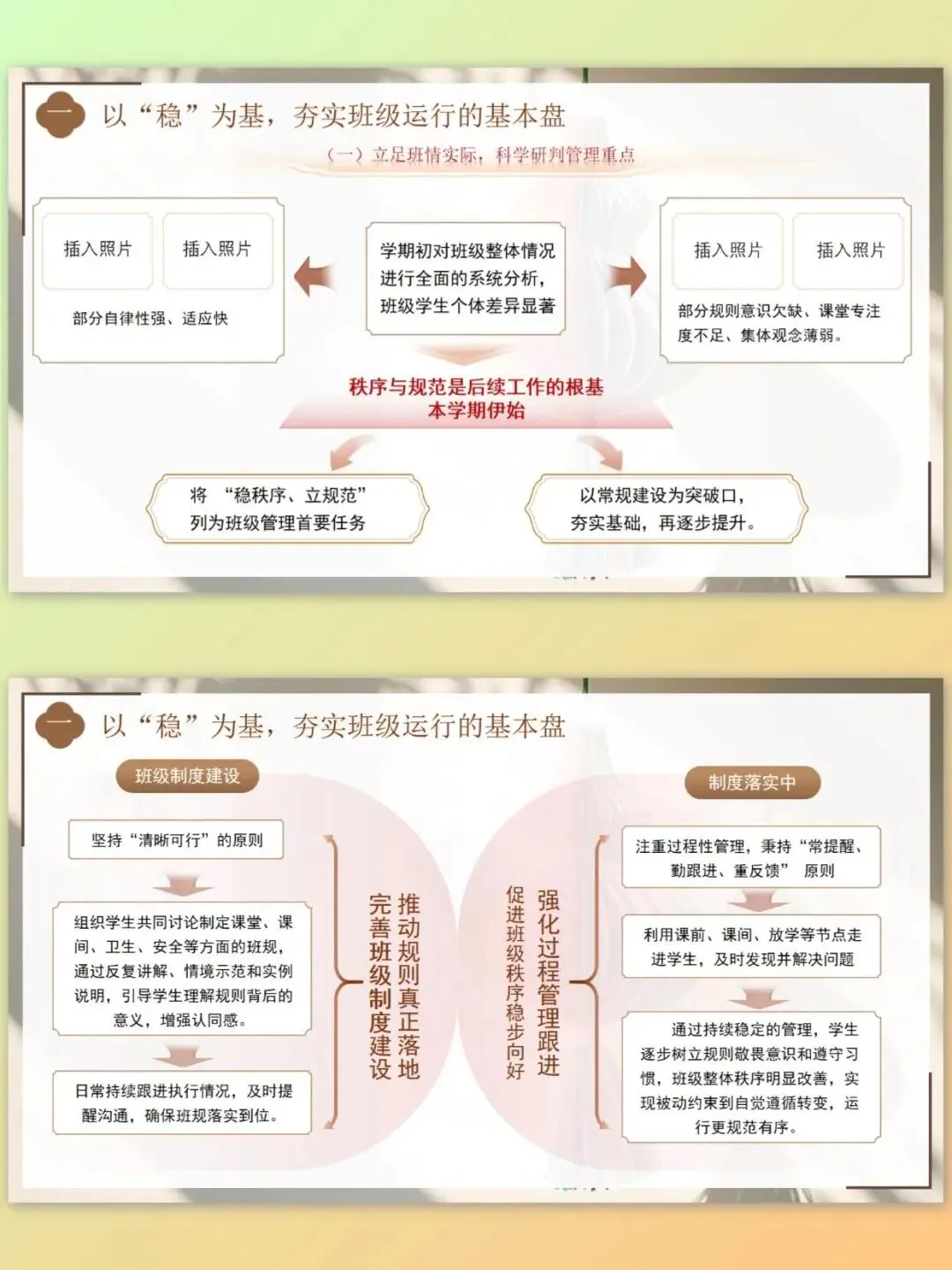 课件为小学班主任期末工作总结/述职报告,主题为:握一束微光耕耘,护一方宁静热土。 课件包含15页PPT+4550字发言稿。 课件目录: 一、以“稳”为基,夯实班级运行的基本盘 二、以“育”为本,把习惯养成落到学生身上 三、以“用”为要,激活班级自我管理的内生动力 四、以“情”为桥,做实做细个体学生的成长支持 五、以“合”为力,持续推进家校协同同向发力 六、以“思”为引,在回望中不断校准育人方向本文内容来源于网络 版权归原作者所有、如有侵权,联系删除