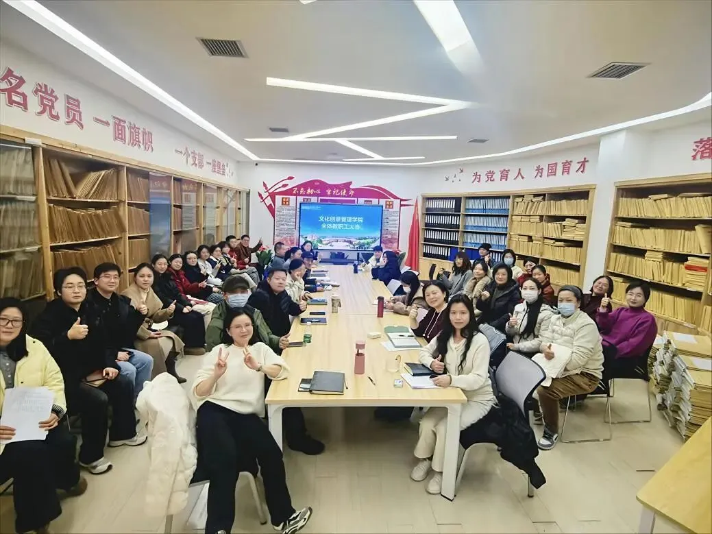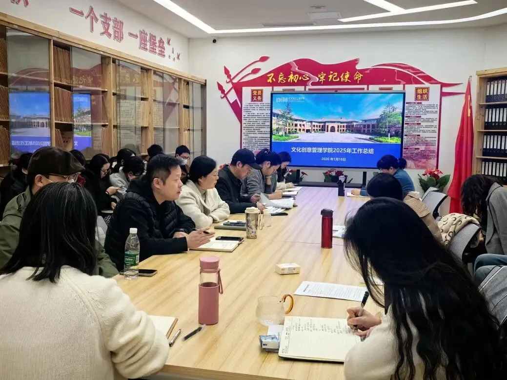 本网讯(通讯员 段向阳)2026年1月18日上午,文化创意管理学院在学院会议室召开2025年度工作总结大会。学院党总支书记胡紫玲、院长湛柏明、副院长祁峰及全体教职工参加会议。会议由院长湛柏明主持。