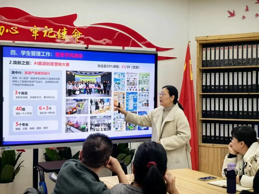 随后,经贸与管理系主任郭若艺、商务英语系主任李卉琼、文化与旅游系主任刘昊昕分别就各系2025年度工作情况进行汇报。各系围绕年度重点工作成果、典型经验与特色亮点、存在问题与改进措施以及2026年度工作计划等方面作了详细阐述,展示了各系在专业建设、教学改革、人才培养等方面的积极探索与显著成效。