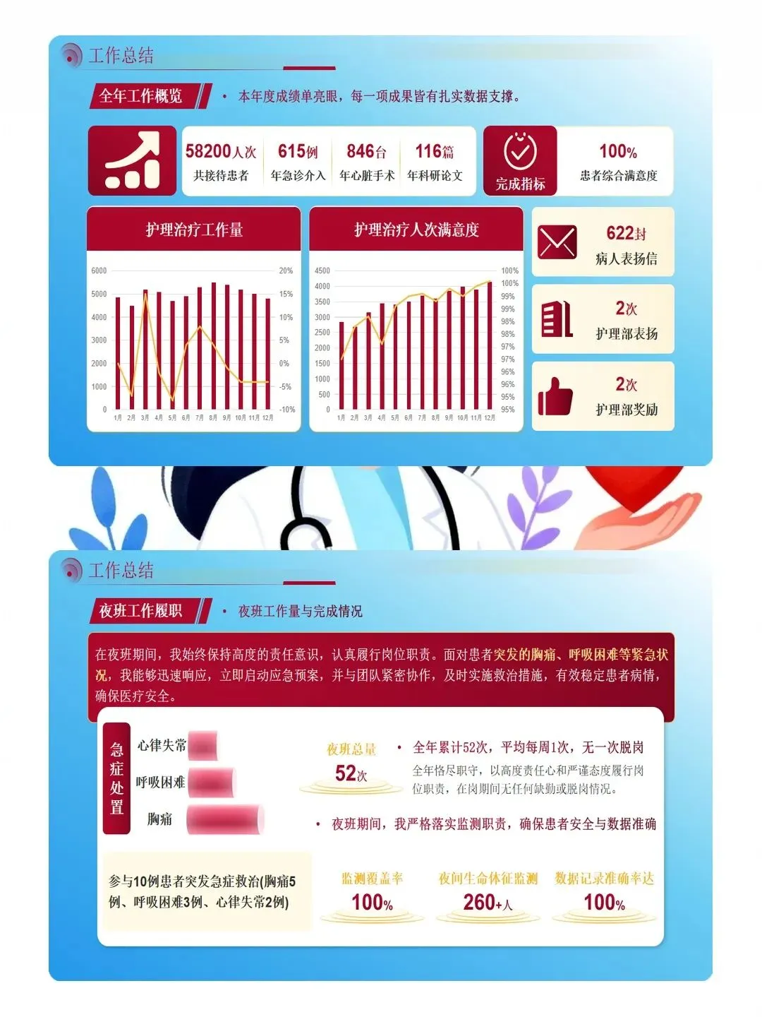 这一年,心内科护理团队交出了一份实打实的成绩单。全年接诊患者 5.8 万人次,预约率达 77.8%,护理文书合格率 99.8%,压疮发生率仅 0.2%。我个人全年值夜班 52 次,参与 10 例急症患者救治,完成基础护理操作 3000 余次,“三查七对” 落实率 100%。在院感防控上,消毒灭菌合格率保持 100%,12 次突击抽查全部达标,用数据筑牢了患者安全防线。