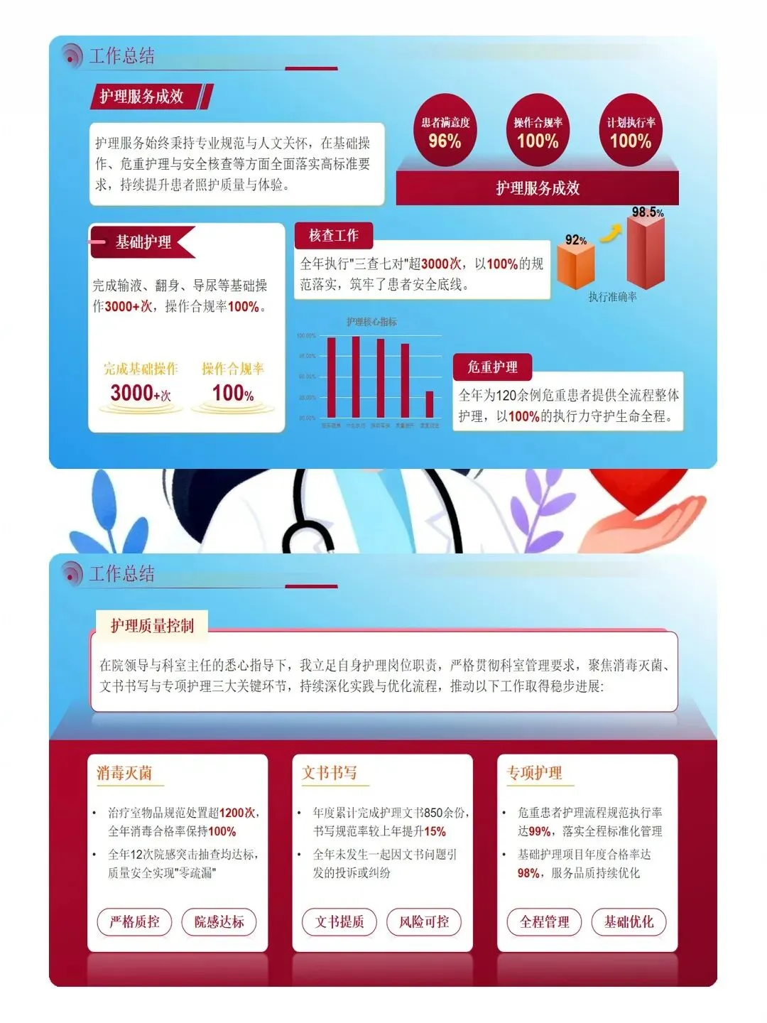 新的一年,我们定下了清晰目标:危重患者护理达标率提升至 98% 以上,不良事件发生率控制在 0.3% 以内。我会继续带着责任与担当,和团队一起在专业提升上再发力,在服务优化上再细化,在流程改进上再突破。护理之路道阻且长,但只要我们心往一处想、劲往一处使,就一定能守护好患者的健康,书写更精彩的护理答卷。