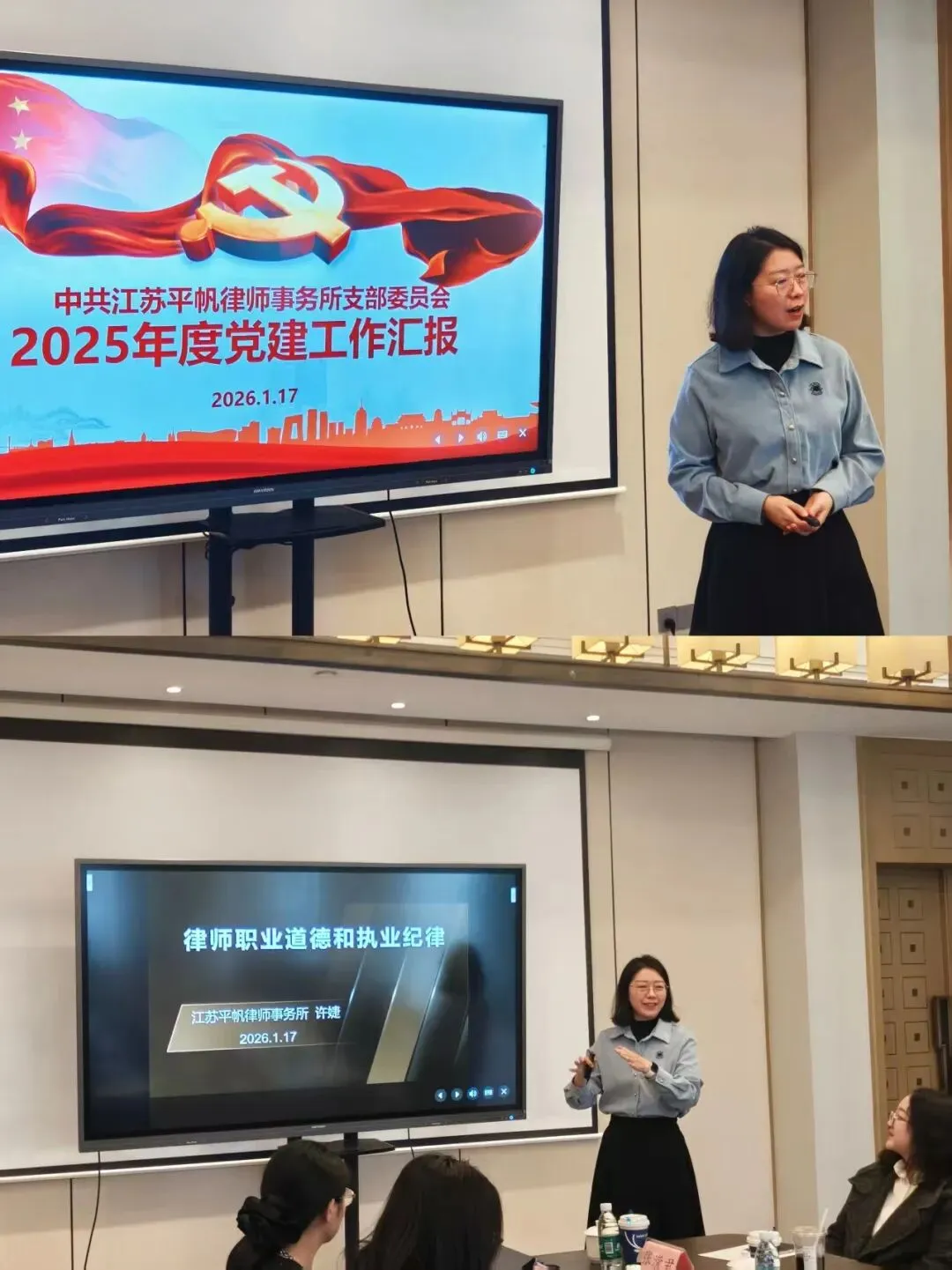 党建工作与执业纪律专题报告。党支部书记许婕律师指出,2025年,支部扎实推进党纪学习教育,并通过共建活动提升组织活力。在支部建设方面,发展一名预备党员,一名入党积极分子。她重点强调了恪守职业道德与执业纪律的“生命线”地位,以律师惩戒案例为教材,要求全员将规范流程、廉洁自律内化于心,共同守护行业与律所的声誉根基。