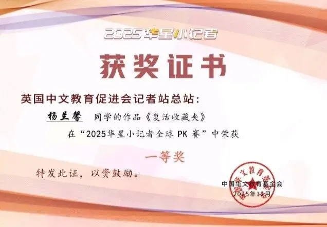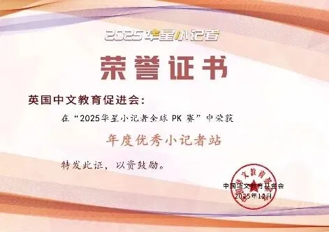 12月29日,在迎接2026年新年来临之际,中国华文教育基金会2025华星小记者全球PK赛落下了帷幕。本届PK赛共收到20个国家32个记者站398名小记者报送的344份作品。来自北京广播电视台的专家评审组围绕作品主题立意、制作水平、创意新颖性、逻辑结构与表达准确度五个维度,评选出一等奖31名、二等奖62名、三等奖101名、优秀奖150名。其中,英国小记者获奖如下: