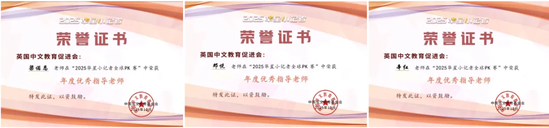 同时,杨兰馨荣获了最佳创意奖,汪佳仪荣获了最佳表现奖, 何晨琴荣获了最具潜力奖。汪佳仪、邓翰辰和杨兰馨三位小记者还荣获了2025年度全球“优秀小记者”称号。邓悦、辛红和梁诺恩三位指导老师荣获了本年度“优秀指导老师”奖。