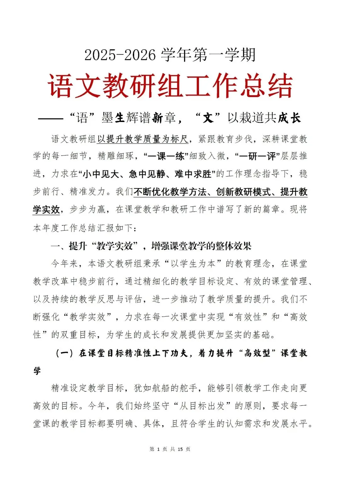 >2025-2026学年第一学期语文教研组工作总结:“语”墨生辉谱新章,“文”以栽道共成长(word版+PPT)