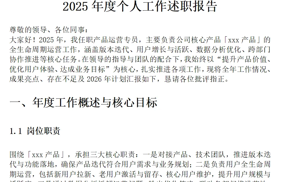 用途:将解析后的纯文本内容,拆解为背景、成果、问题、计划等结构化单元,提取核心数据与关键信息,为后续汇报框架搭建做准备。