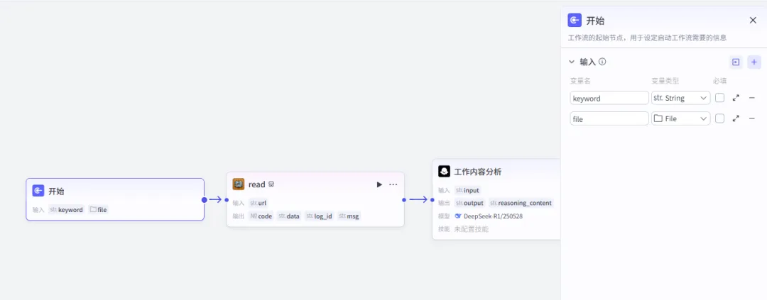 用途:接收用户输入的核心信息,定义输入规范,为后续流程提供初始参数,是工作流的“启动开关”。