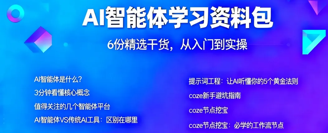 对了,为了帮大家更高效地玩转智能体、少走弯路,我专门整理了一份智能体入门干货资料包,涵盖从基础认知到实操落地的核心内容: