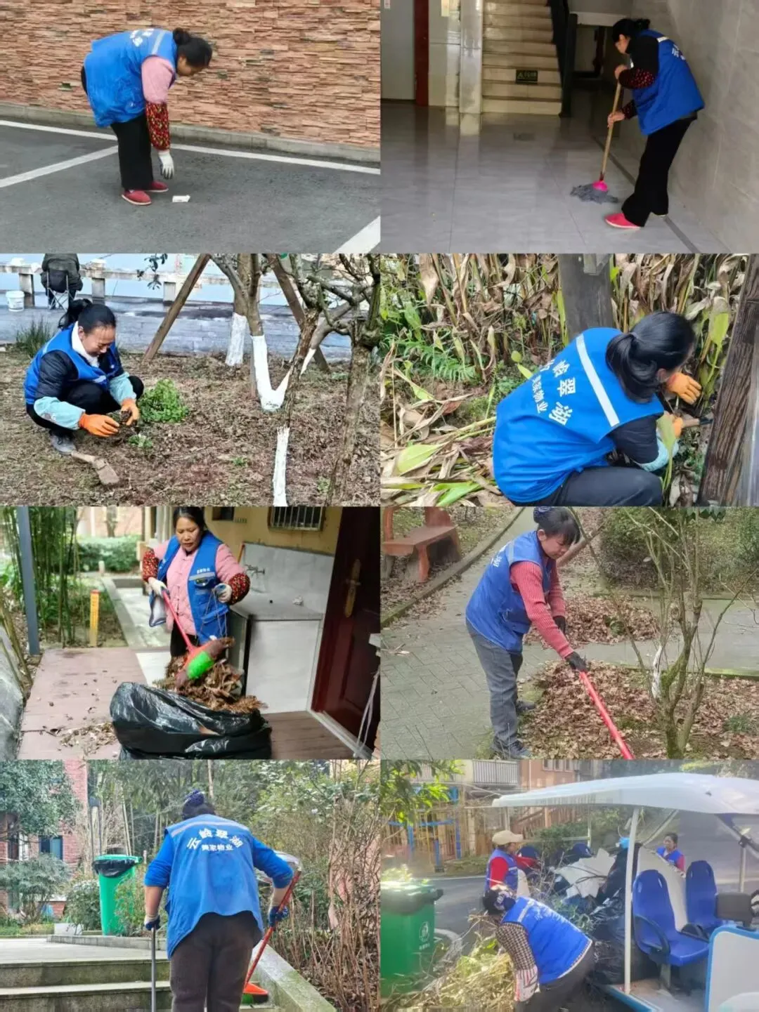 本周完成单元楼道地面拖拭及清理绿化带内枯枝。