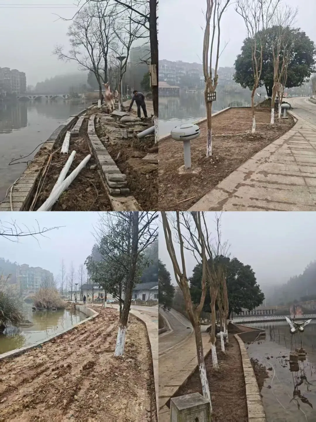 步道绿化改造施工,打造沿湖荷花景观带。
