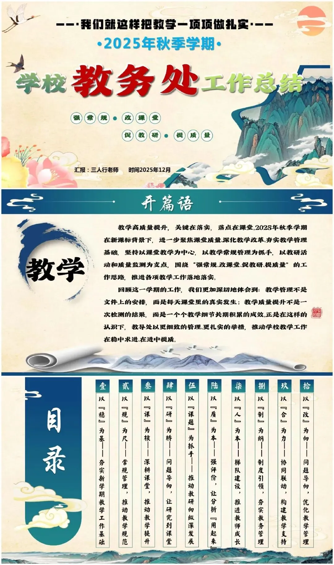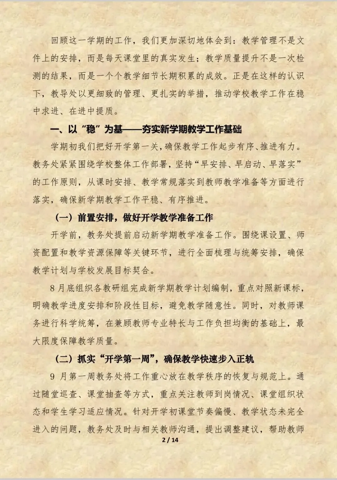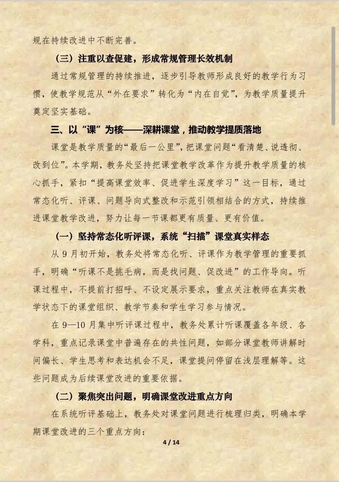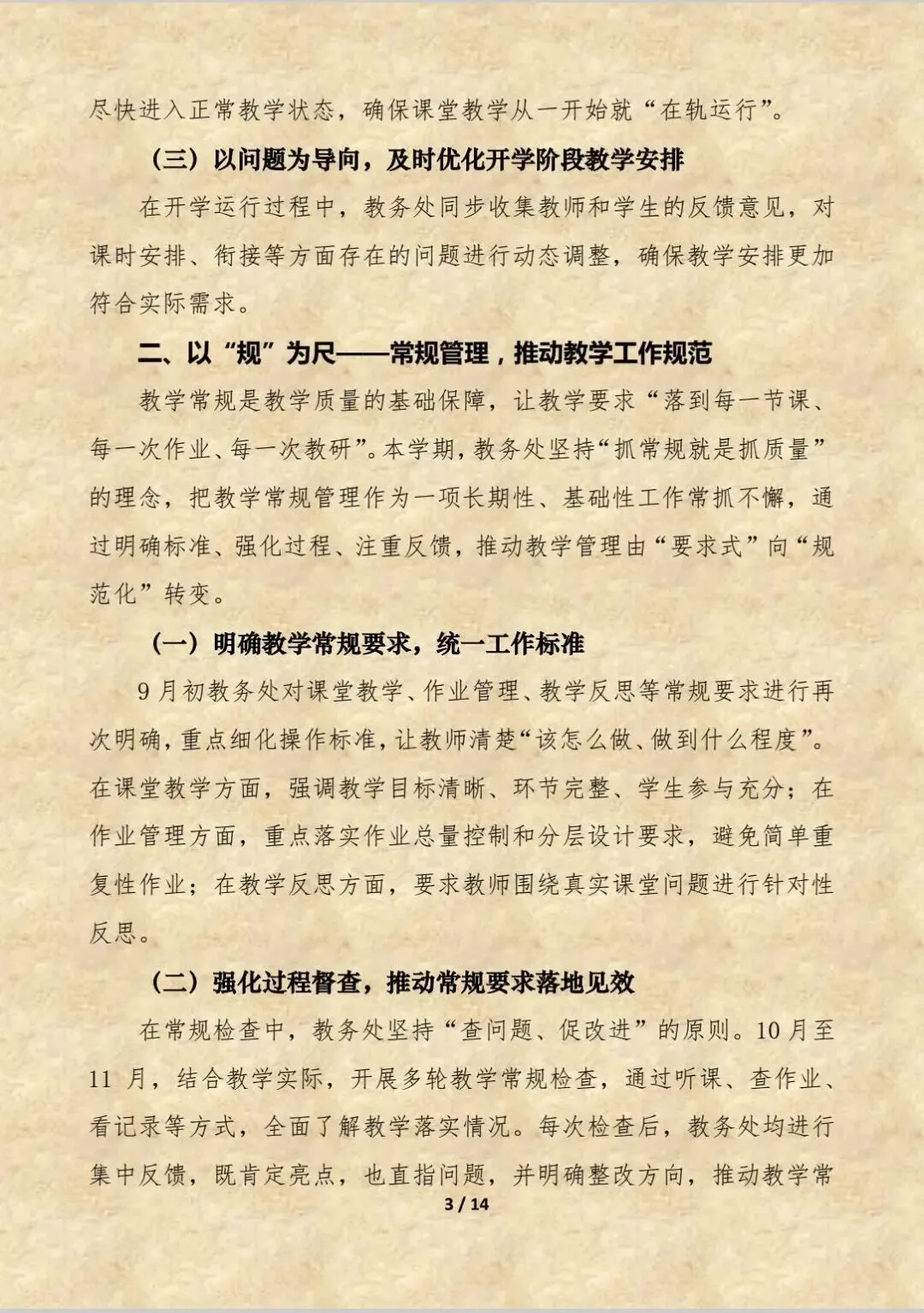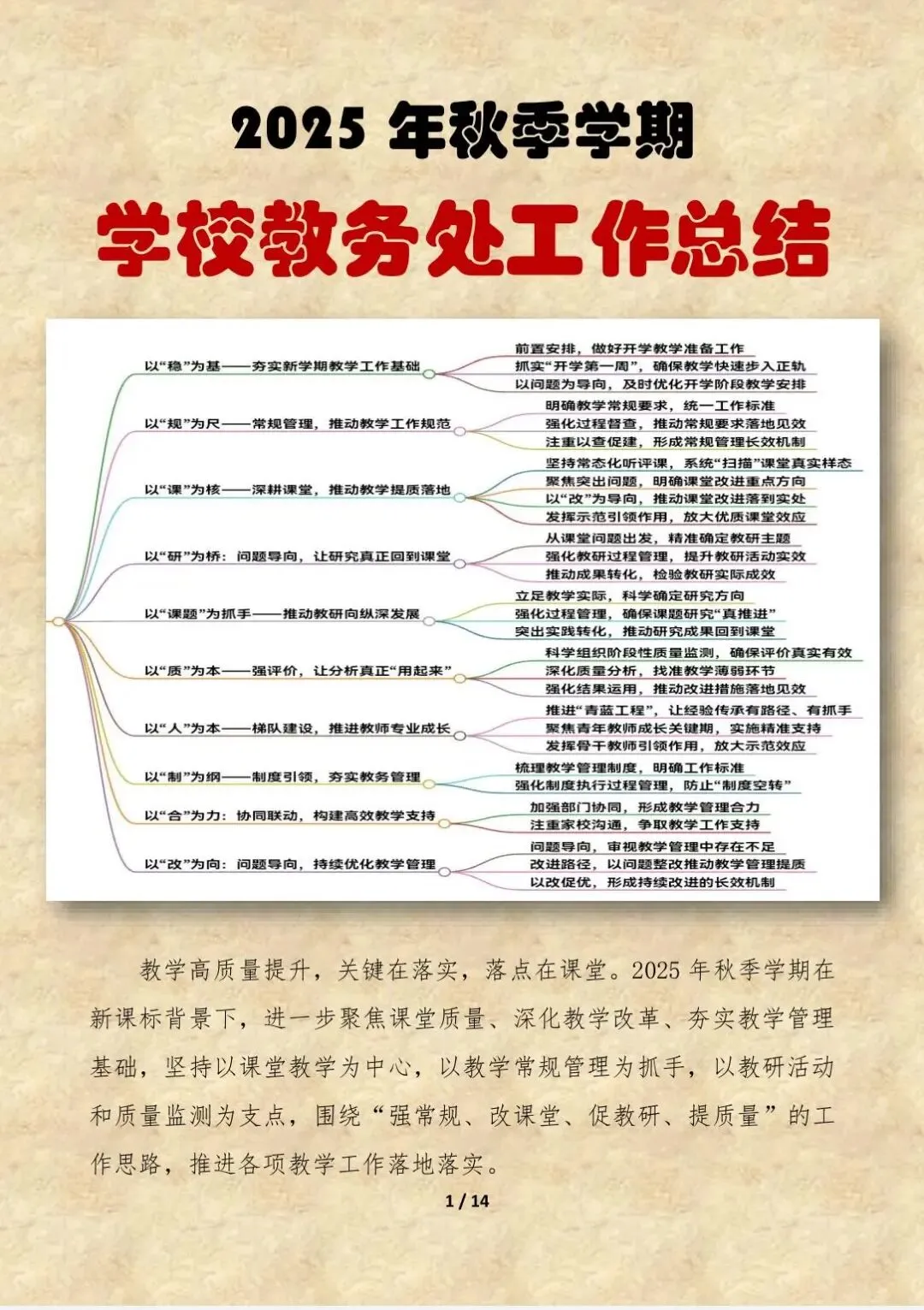 我们就这样把教学一项项做扎实——2025年秋季学校教务处工作总结 一、以“稳”为基——夯实新学期教学工作基础 (一)前置安排,做好开学教学准备工作 (二)抓实“开学第一周”,确保教学快速步入正轨 (三)以问题为导向,及时优化开学阶段教学安排 二、以“规”为尺——常规管理,推动教学工作规范 (一)明确教学常规要求,统一工作标准 (二)强化过程督查,推动常规要求落地见效 (三)注重以查促建,形成常规管理长效机制 三、以“课”为核——深耕课堂,推动教学提质落地 (一)坚持常态化听评课,系统“扫描”课堂真实样态 (二)聚焦突出问题,明确课堂改进重点方向 (三)以“改”为导向,推动课堂改进落到实处 (四)发挥示范引领作用,放大优质课堂效应 四、以“研”为桥:问题导向,让研究真正回到课堂 (一)从课堂问题出发,精准确定教研主题 (二)强化教研过程管理,提升教研活动实效 (三)推动成果转化,检验教研实际成效 五、以“课题”为抓手——推动教研向纵深发展 (一)立足教学实际,科学确定研究方向 (二)强化过程管理,确保课题研究“真推进” (三)突出实践转化...本文内容来源于网络 版权归原作者所有、如有侵权,联系删除