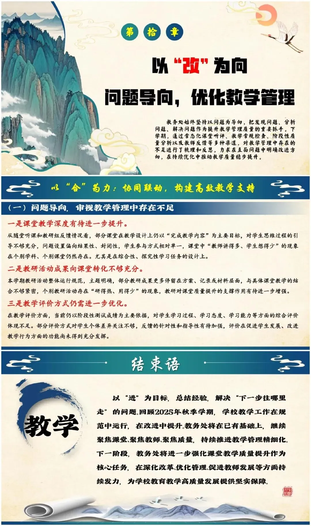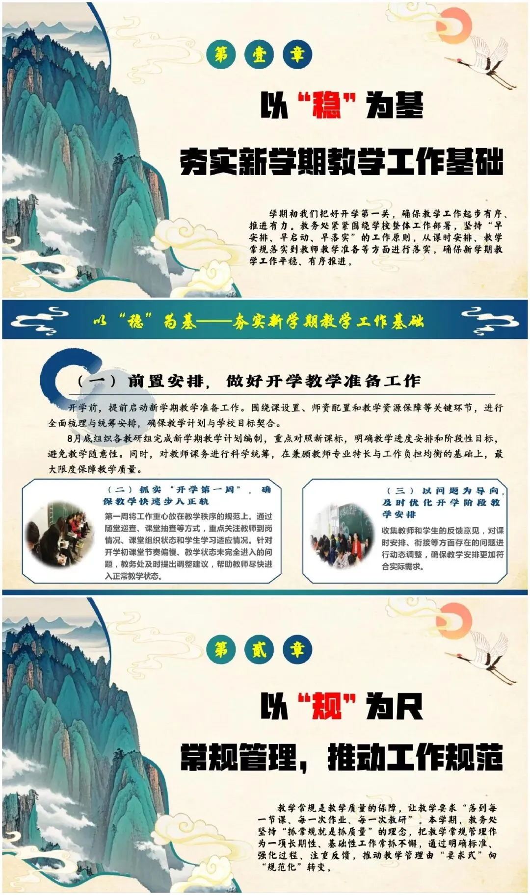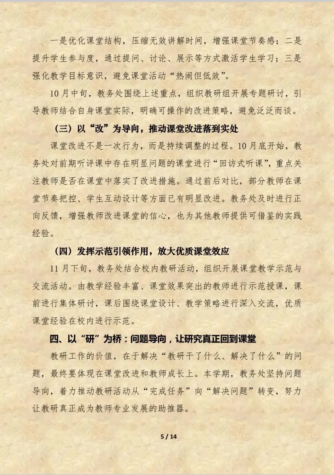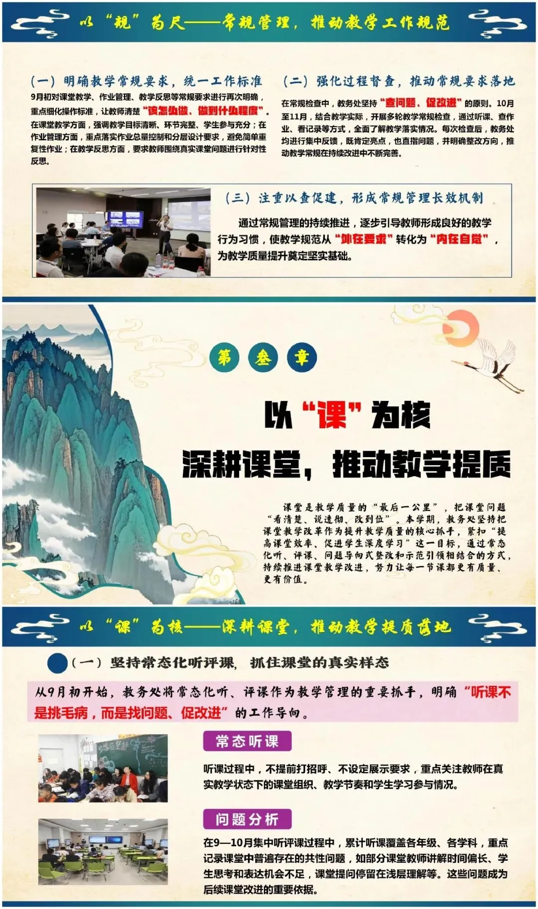 我们就这样把教学一项项做扎实——2025年秋季学校教务处工作总结 一、以“稳”为基——夯实新学期教学工作基础 (一)前置安排,做好开学教学准备工作 (二)抓实“开学第一周”,确保教学快速步入正轨 (三)以问题为导向,及时优化开学阶段教学安排 二、以“规”为尺——常规管理,推动教学工作规范 (一)明确教学常规要求,统一工作标准 (二)强化过程督查,推动常规要求落地见效 (三)注重以查促建,形成常规管理长效机制 三、以“课”为核——深耕课堂,推动教学提质落地 (一)坚持常态化听评课,系统“扫描”课堂真实样态 (二)聚焦突出问题,明确课堂改进重点方向 (三)以“改”为导向,推动课堂改进落到实处 (四)发挥示范引领作用,放大优质课堂效应 四、以“研”为桥:问题导向,让研究真正回到课堂 (一)从课堂问题出发,精准确定教研主题 (二)强化教研过程管理,提升教研活动实效 (三)推动成果转化,检验教研实际成效 五、以“课题”为抓手——推动教研向纵深发展 (一)立足教学实际,科学确定研究方向 (二)强化过程管理,确保课题研究“真推进” (三)突出实践转化...本文内容来源于网络 版权归原作者所有、如有侵权,联系删除