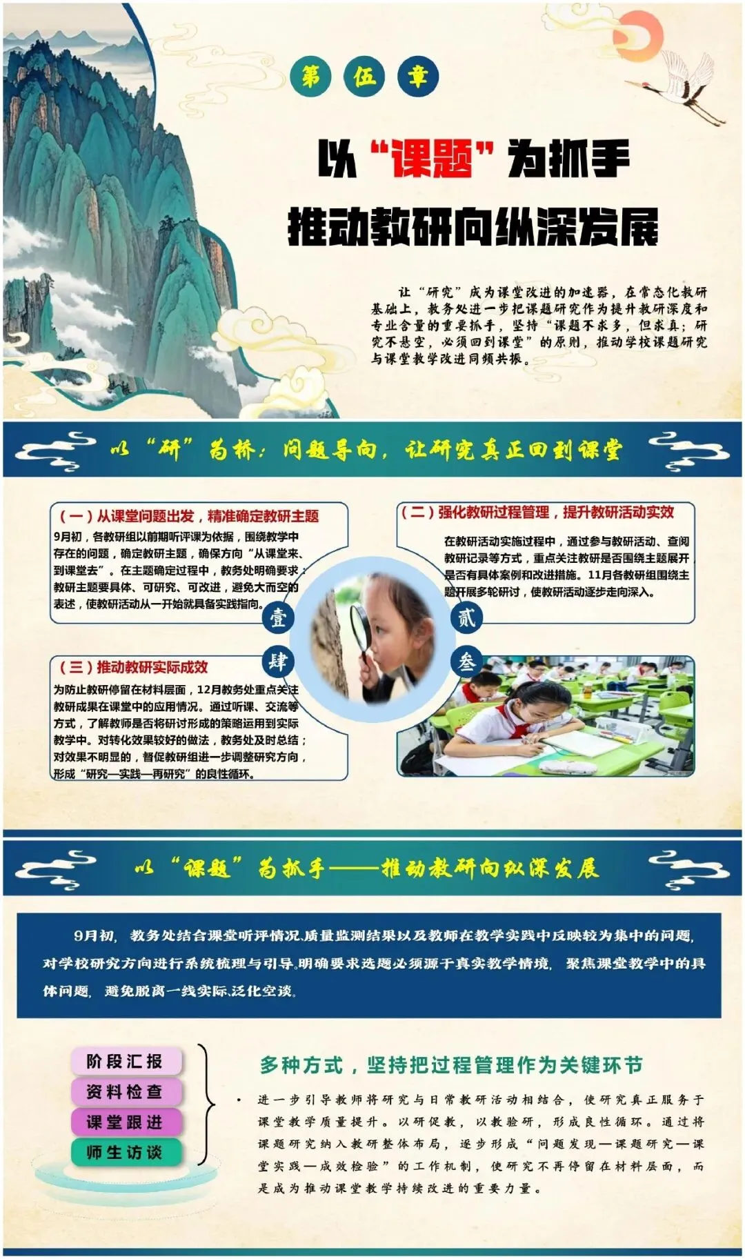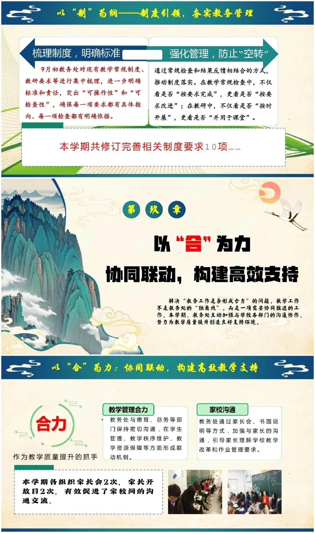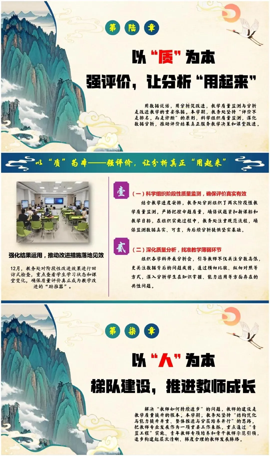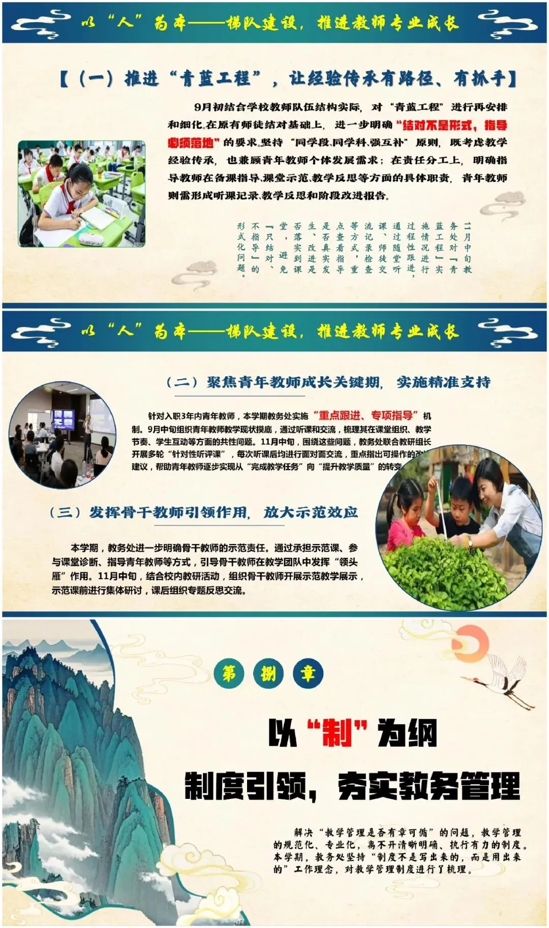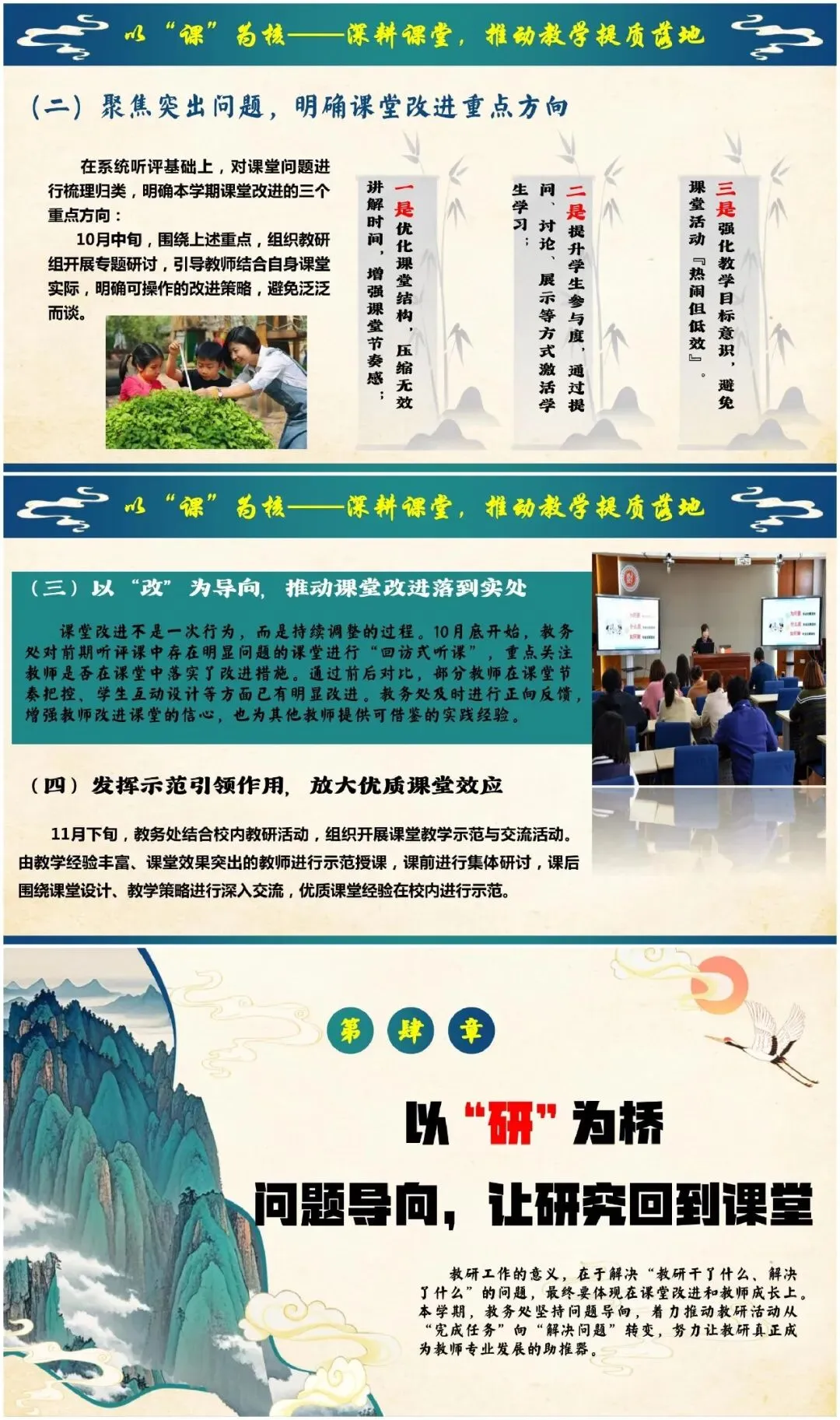 我们就这样把教学一项项做扎实——2025年秋季学校教务处工作总结 一、以“稳”为基——夯实新学期教学工作基础 (一)前置安排,做好开学教学准备工作 (二)抓实“开学第一周”,确保教学快速步入正轨 (三)以问题为导向,及时优化开学阶段教学安排 二、以“规”为尺——常规管理,推动教学工作规范 (一)明确教学常规要求,统一工作标准 (二)强化过程督查,推动常规要求落地见效 (三)注重以查促建,形成常规管理长效机制 三、以“课”为核——深耕课堂,推动教学提质落地 (一)坚持常态化听评课,系统“扫描”课堂真实样态 (二)聚焦突出问题,明确课堂改进重点方向 (三)以“改”为导向,推动课堂改进落到实处 (四)发挥示范引领作用,放大优质课堂效应 四、以“研”为桥:问题导向,让研究真正回到课堂 (一)从课堂问题出发,精准确定教研主题 (二)强化教研过程管理,提升教研活动实效 (三)推动成果转化,检验教研实际成效 五、以“课题”为抓手——推动教研向纵深发展 (一)立足教学实际,科学确定研究方向 (二)强化过程管理,确保课题研究“真推进” (三)突出实践转化...本文内容来源于网络 版权归原作者所有、如有侵权,联系删除