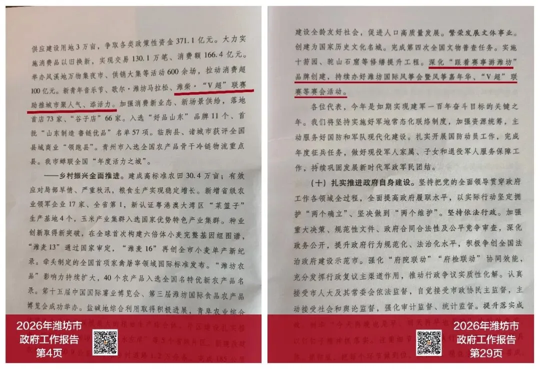 本次政府工作报告将“V超”与潍坊国际风筝会等传统品牌活动并列,将持续办好“V超”与创建国家历史文化名城、完成全国文物普查任务、持续办好风筝会等重点工作共同阐述。不仅是对“V超”的认可,更明确了“V超”作为城市文化品牌的重要载体之一,与风筝会等传统品牌活动协同,共同构建多元化、高层次的城市赛会活动体系,服务于城市形象提升、文化旅游消费促进及社会精神文化建设。